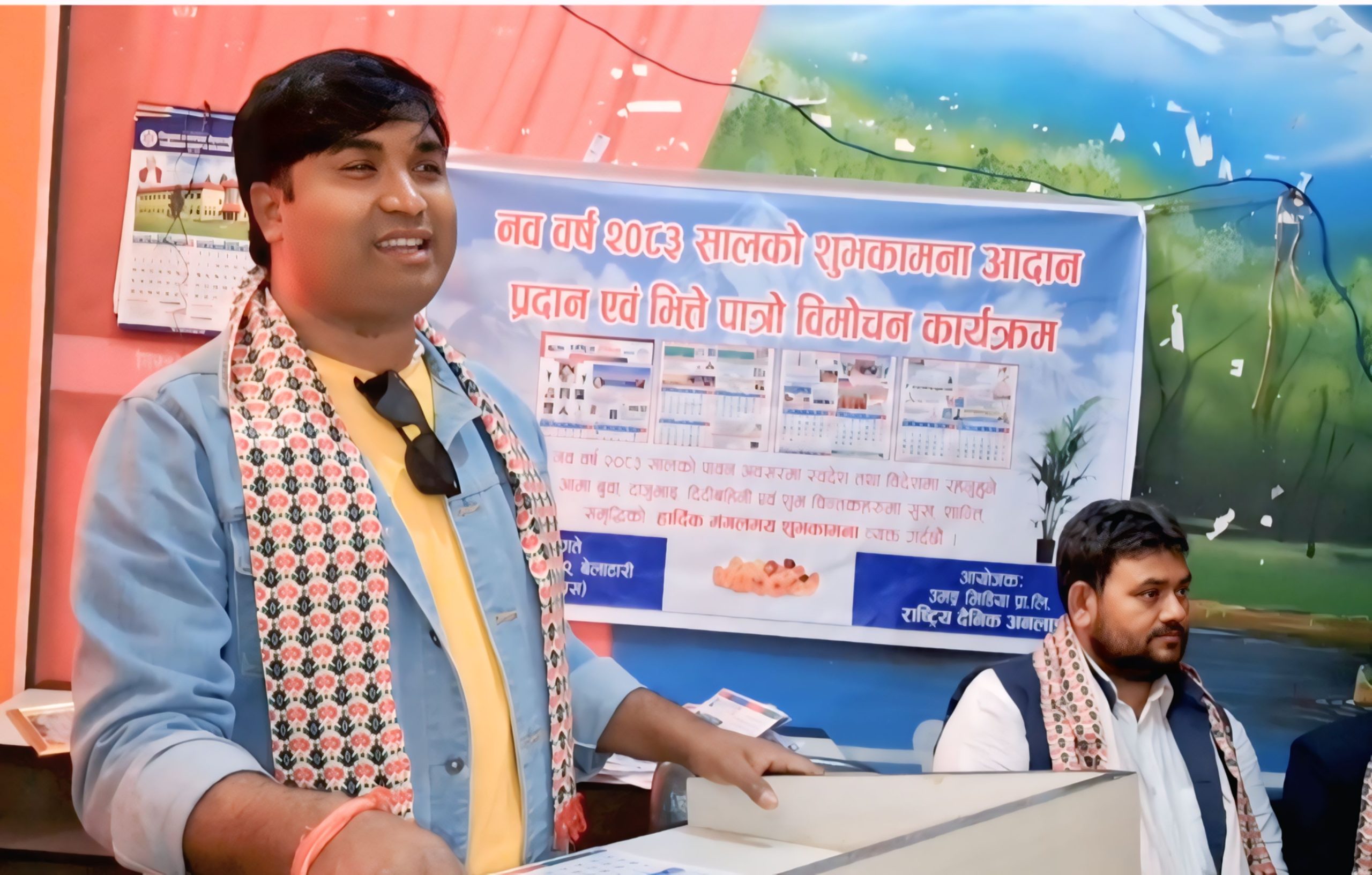राष्ट्रिय दैनिक / नवलपरासी,४ बैशाख उमंग मिडिया प्रा.लि. द्वारा सञ्चालित राष्ट्रिय दैनिकले प्रकाशन गरेको “भित्तेपात्रो–२०८३” विमोचन कार्यक्रममा बोल्दै राष्ट्रिय दैनिकका अध्यक्ष एवं कार्यकारी निर्देशक उमेश बि.कले बालेन सरकारद्वारा अवलम्बन गरिएको मिडिया नीतिप्रति कडा असन्तोष व्यक्त गर्नुभएको छ। कार्यक्रममा बोल्दै उहाँले स्थानीय तहबाट सञ्चार माध्यमले पाउँदै आएको विज्ञापन तथा सूचना प्रवाहमा देखिएको अवरोधलाई लोकतान्त्रिक मूल्य […]