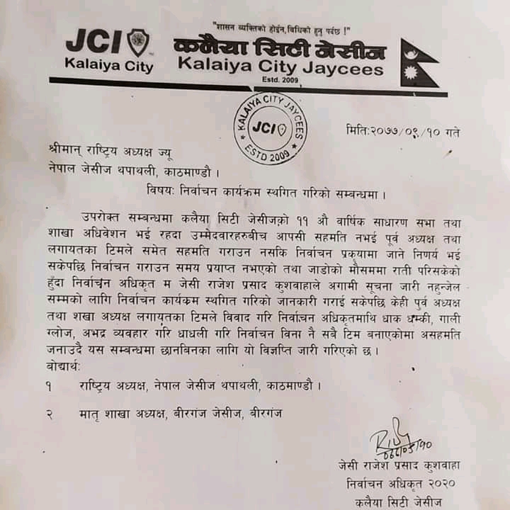 कलैया सिटि जेसीजको निर्वाचन कार्यक्रम स्थगित