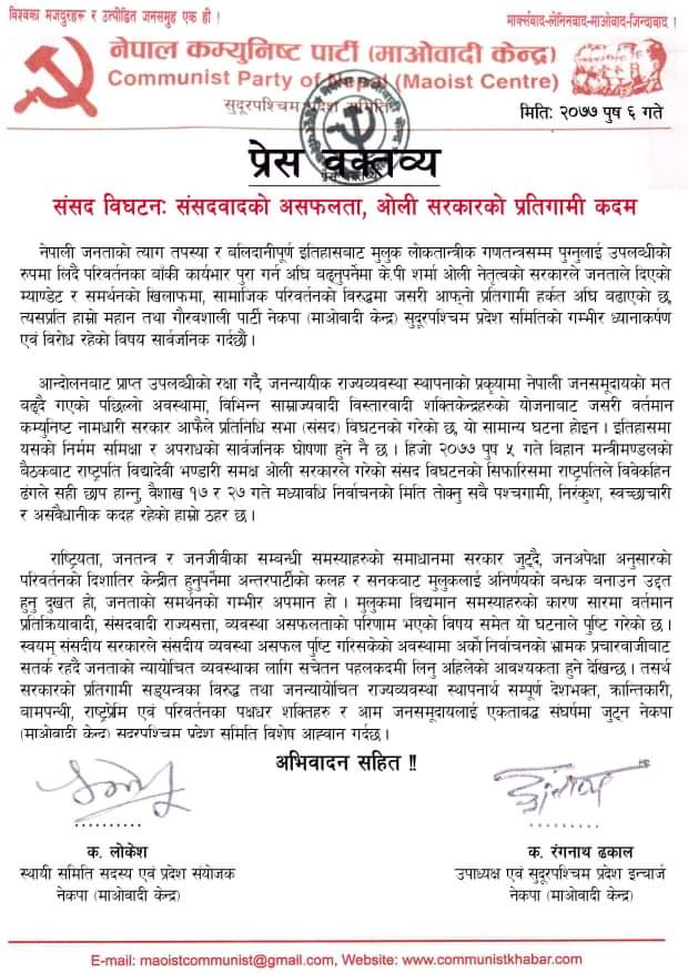 संसद विघटनबारे माओवादी केन्द्रको धारणा–‘संसदवादको असफलता, ओली सरकारको प्रतिगामी कदम’ (वक्तव्यको पूर्णपाठसहित)