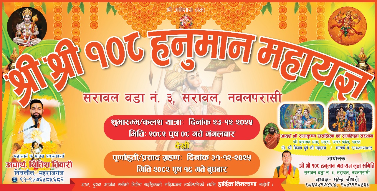 सरावल–३ मा पुस ८ देखि १६ गतेसम्म श्री श्री १०८ हनुमान महायज्ञ हुने