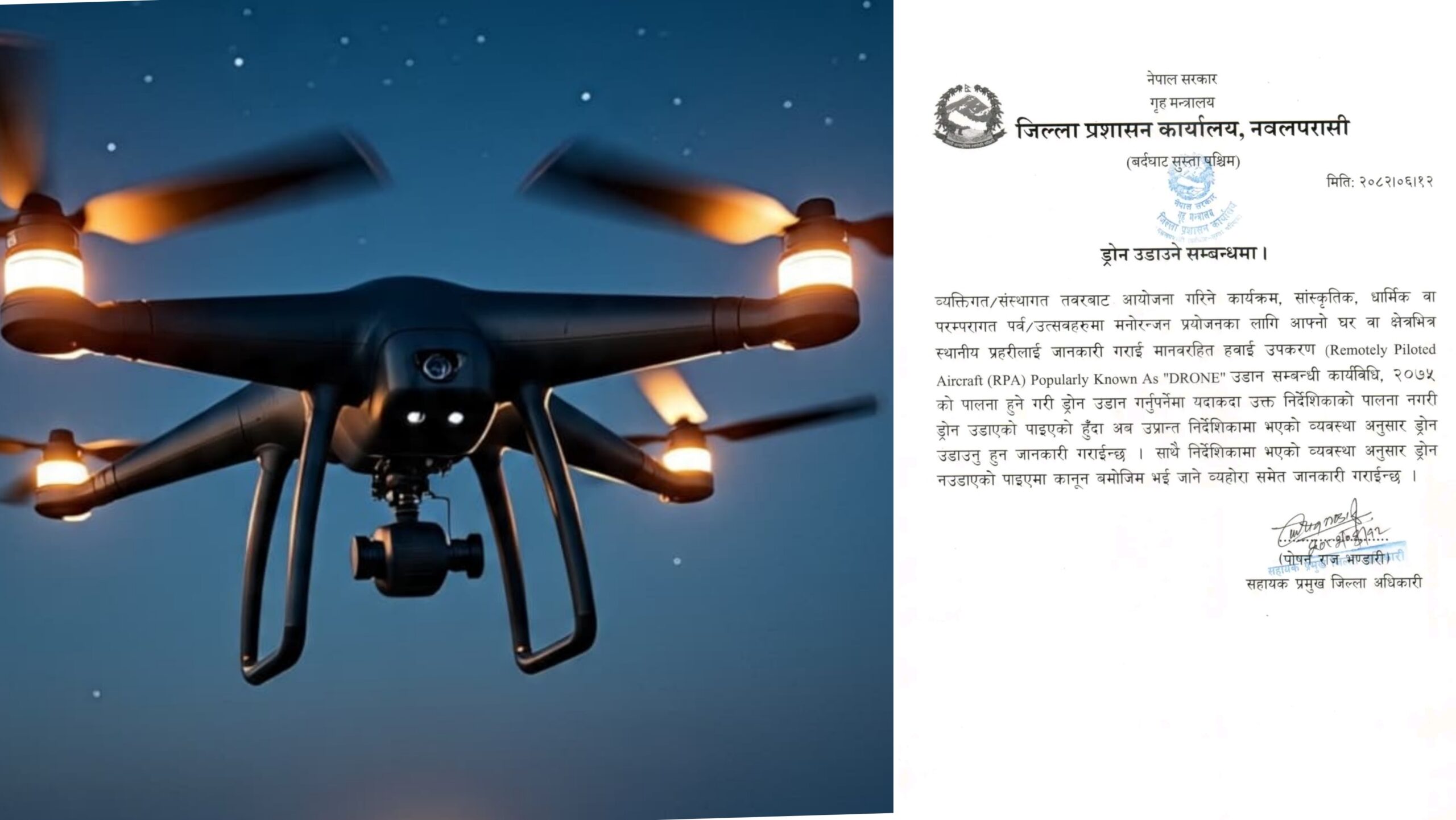 जिल्ला प्रशासन कार्यालय नवलपरासीको चेतावनी:प्रहरीलाई जानकारी बिना ड्रोन उडाए कारबाही हुने