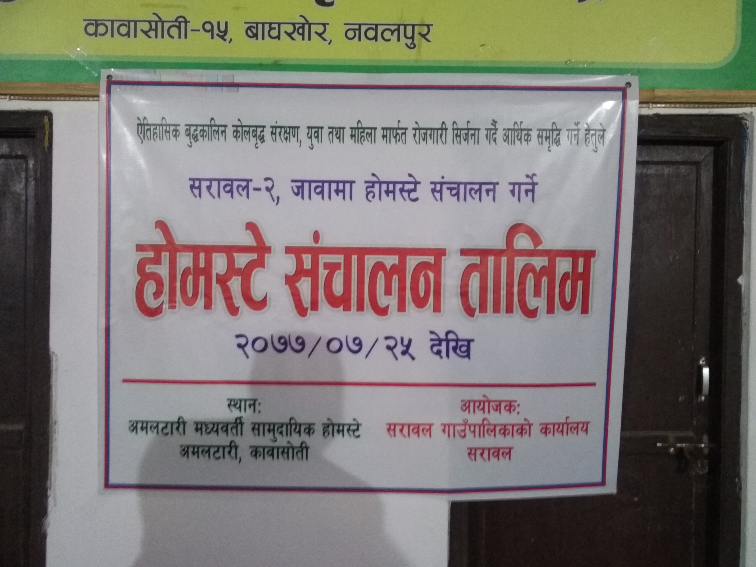उमेश बि.क / नवलपरासी ,२५ कार्तिक नवलपरासी जिल्लाकाे सरावल गाउँपालिका वडा नं. २ जावा अन्तर्गतरहेको प्रमुख पर्यटकीय स्थल काेलबृक्षकाे पर्यटन प्रबर्द्धनकाे लागि हाेमस्टे सन्चालन तालिम सुरु भएकाे छ । एेतिहासिक बुद्धकालिन काेलबृक्ष संरक्षण , पर्यटन क्षेत्रको बिकास , कला सँस्कृतिको जगेर्ना , प्राचीन ककरपत्त नगरको प्रचारप्रसार गर्न साथै युवा र महिला मार्फत राेजगारी सृजना गर्दै अार्थिक समृद्धि गर्ने उद्देश्यले सरावल गाउँपालिकाको आयोजनामा ३ दिने “होमस्टे सँचालन” सम्बन्धि तालिम कावासाेति नगरपालिका स्थित अमलटारी हाेमस्टेमा एक कार्यक्रम बिच समुदघाटन गरि तालिम सुरु गरिएको हाे। सरावल गाउँपालिका उपाध्यक्ष उत्तमा रायकाे अध्यक्षता तथा गाउँपालिका अध्यक्ष राधेश्याम चाैधरीकाे प्रमुखअातिथ्यतामा सन्चालन भएको तालिमको उद्घाटन गर्दै अध्यक्ष चाैधरीले जावाकाे काेलबृक्ष संरक्षण तथा पर्यटन विकासमा हाेम स्टेकाे संचालनपछि धेरै सम्भावनाकाे उजागर हुनुकाे साथै यसलाई अर्गानिक गन्तव्यकाे रुपमा प्रचारप्रसार गर्नुपर्ने बताउनु भयाे । स्थानीय उत्पादनकाे बजारीकरणसँगसँगै स्थानिय स्तरमै राेजगारी सृजना गर्न तालिमले सघाउ पुग्ने बताउँदै हाेमस्टेकाे सन्चालन र प्रचारप्रसारमा गाउँपालिका बिशेष काम गर्न चाहेकाे बताउनु भयाे । सिकाइ जिवनप्रयान्त चल्ने प्रक्रिया भएको हुनाले ३ दिनको समयमा धेरै भन्दा धेरै सिकाइ हासिल गरि आफुहरूले सिकेको सिपलाई आर्थिक आयआर्जनको रूपमा अगाडि बढाउनुपर्ने बताउनुभएको हाे। त्यस्तै प्रमुख प्रशासकीय अधिकृत बुद्ध प्रकास पाैडेलले प्राचिन ऐतिहासिक बुद्धकालिन ककरपत्त नगर (राष्ट्रिय एवं अन्तर्राष्ट्रिय प्रबल पर्यटकीय सम्भावना बोकेको महत्वपुर्ण स्थान जावाकाे काेलबृक्षलाई राष्ट्रिय तथा अन्तर्राष्ट्रिय स्तरमा चिनाउन हाेम स्टे राम्रो माध्यम हुने भएकाेले हाेमस्टे संचालनका लागि गाउँपालिकाबाट स्थानीय ब्यक्तिका लागि विशेष सहयोग र साथ सहित अाफुहरुले हरपल सहयोग गर्ने प्रतिबद्धता व्यक्त गर्नु भयाे । त्यस्तै वडा नं. १ का वडा अध्यक्ष भेष नरायण चाैधरीले नमुना पर्यटकीय हाेम स्टेकाे रुपमा विकासको लागि पहल गर्नुपर्ने बताउनु भयाे । १५ जना सहभागीता रहेकाे तालिममा हाेमस्टे संचालनकाे प्रक्रिया, अतिथि सत्कार, स्थानिय परिकारहरुकाे निर्माण, स्थानिय पर्यटकीय स्थलहरुकाे प्रवद्वन तथा सांस्कृतिक गतिविधिकाे बारेमा तालिम दिने प्रशिक्षक प्रेम शंकर मरदनियाले बताउनु भयाे । हाेमस्टे सन्चालन तालिमकाे उदघाटनमा मिडिया एसाेसियन नवलपरासीका अध्यक्ष बेचु गाैड,लेखा अधिकृत नरायण पाण्डे,याेजनाशाखा प्रमुख राजन बस्याल लगाएतले ३ दिनको तालिममा धेरै भन्दा