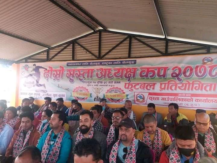 राष्ट्रिय दैनिक / नवलपरासी , १४ फाल्गुन पश्चिम नवलपरासीको सुस्ता गाउँपालिका वडा नम्बर ४ नर्सहीमा दोस्रो सुस्ता अध्यक्ष कप खुल्ला पुरुष फुटवल प्रतियोगिता शुरु भएको छ । ” स्वास्थ्यकाे लागि खेलकुद राष्ट्रकाे लागि खेलकुद ” मुलनारा साथ सुस्ता गाउँपालिका अध्यक्ष राम प्रसाद पाण्डेयको अध्यक्षता तथा लुम्बिनी प्रदेश सभा सदस्य दिपेन्द्र कुमार अधिकारीकाे प्रमुख अातिथ्यतामा फुटबल उदघाटन भएको हाे । प्रमुख अतिथि अधिकारीले विभिन्न खेलहरुले युवाहरुलाई कुलतबाट बचाउने भएकाले यस क्षेत्रमा निकट भबिष्यमा खेल क्षेत्रको बिकासका लागि आफुले सक्दो पहल गर्ने र खेलकुद स्वास्थ्यको लागी धेरै उपयोगी मानिने भएकोले स्थानिय स्तरमा हुदै गरेका खेलकुद र खेलकुदका खेलाडीलाई उत्कृष्ट खेलाडीको रुपमा विकास गरि राष्ट्रिय स्तरमा पुर्याउन सकिए वडाको मात्रै नभई समग्र गाउँपाकिला र जिल्लाकै नाम अगाडी जाने चर्चा गर्नुभयो । कार्यक्रममा अध्यक्ष पाण्डेले खेलकुदका लागि पालिकाले आफ्नो क्षमता अनुसार काम गरेको जानकारी दिए । उनले युवा पंक्तिलाई सही मार्गमा ल्याउन समेत खेलकुदको बिशेष भुमिका हुने बताउनुभयो । कार्यक्रममा सुस्ता गाउँपालिका उपाध्यक्ष इन्द्र कुमारी थरुनी ,सरावल खेलकुद संस्थाका अध्यक्ष महेन्द्र चौधरी,मदन भण्डारी स्पोर्ट्स एकाडेमीका केन्द्रिय सदस्य डा.सुबास चन्द चौधरी लगाएतले बोल्नुभएको प्रमुख प्रशासकीय अधिकृत बुद्ध प्रकाश पौडेलले जानकारी दिनुभयो । कार्यक्रममा बिभिन्न तहका खेल प्रेमीहरुको उल्लेख्य उपस्थिति रहेको अधिकृत पौडेलले बताउनुभयो । कार्यक्रममा स्वागत मन्तव्य सुस्ता गाउँपालिका वार्ड न ४ का वडाध्यक्ष अशोक कुमार गुरुङ्ग र संचालन सुस्ता गाउँपालिका कार्यालयका योजना तथा प्रशासन प्रमुख बिष्णु प्रसाद ढकालले गर्नुभएको थियो खेल संयोजक धीरज गुरुंगका अनुसार प्रतियोगिताको उद्घाटनकै दिन भएको प्रतियोगितामा सुस्ता ११ र नव युवा कल्ब बर्दघाट १६ सुर्यनगरबीच खेल भएको छ । खेलमा सुस्ता ११ लाई नव युवा कल्ब बर्दघाट १६ सुर्यनगरले ० का बिरुद्ध एक गोलले पराजित गरेको छ । प्रतियोगितामा १२ टीम सहभागी छन् । प्रतियोगितामा प्रथम हुने टिमले १ लाख ५० लाख रुपैया र द्धितीय हुने टिमले १ लाख प्राप्त गर्नेछन् । त्यस्तै फागुन २५ गते राइजिङ स्टार भुमही र मायादेवी युवा क्लब देवदहबीच खेल हुने गुरुंगले जानकारी दिनुभयो । राष्ट्रिय दैनिक राष्ट्रिय दैनिक एक लोकप्रिय नेपाली समाचार पोर्टल हो। हामी सत्य तथ्य निश्पक्ष र सन्तुलित समाचार सम्प्रेषण गर्ने तर्फ उद्दत छौँ । हाम्रा टोल,समाज, शहर वा आम जनताका चुलो चौको देखि सदन सम्म अथवा समाजका उदाहरणीय ब्यक्ति, रास्ट्रका पहरेदार हरेक बिषय हाम्
