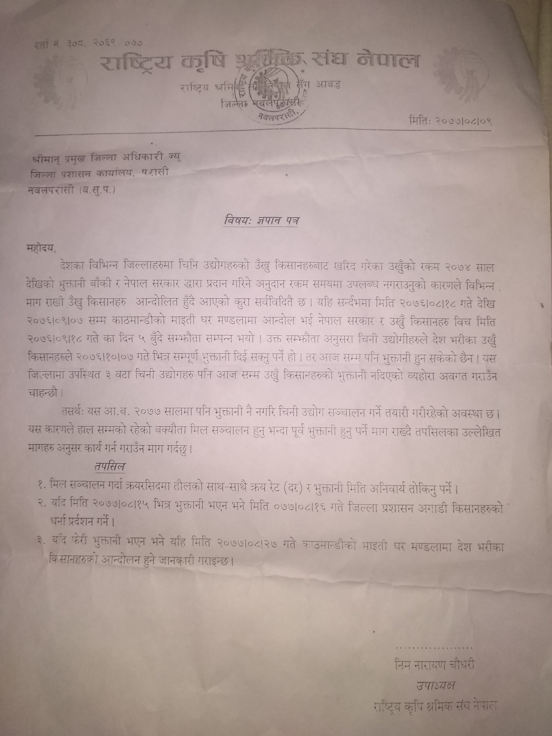 देशबन्धु यादव / मंसिर १० नवलपरासी राष्ट्रिय कृषि श्रमिक संघ नेपालले विभिन्न माग राख्दै जिल्ला प्रशासन कार्यालय पश्चिम नवलपरासीमा ज्ञापन पत्र बुझाएको छ। नेपाल सरकार र उखु किसानबिच ५ बुँदे सम्झौता भए पनि सम्झौता अनुसार चिनि उद्योगीहरुले किसानलाई समयमा भुक्तानी नगरेको भन्दै ज्ञापन पत्र बुझाएको हाे। नवलपरासी अन्तर्गत ३ वटा चिनि उद्योगले पनि समयमा रकम भुक्तानी नगरेको भन्दै तीन बुन्दे माग सहित राष्ट्रिय कृषि श्रमिक संघ नेपालीको उपाध्यक्ष निम नरायण चाैधरी सहितको टाेलिले सहायक प्र.जि.अ जाेरा सिंह माझीलाई ज्ञापन पत्र बुझाएका हुन । ज्ञापन पत्रमा मिल सन्चालन गर्दा क्रयरसिदमा ताैलकाे साथसाथै क्रयरेट र भुक्तानी मिति अनिवार्य ताेकिनुपर्ने, २०७७ मंसिर १५ गते भित्र भुक्तानी भएन भने मंसिर १६ गते जिल्ला प्रशासन अगाडि किसानले धर्ना दिने तथा भुक्तानीमा ढिलासुस्ती भएमा २०७७ मंसिर २७ गते काठमाडौंकाे माइती घर मण्डलामा देशभरिका किसानहरुले अान्दाेलन गर्ने जानकारी सहित ज्ञापन पत्र बुझाएका हुन । ज्ञापन पत्र राष्ट्रिय कृषि श्रमिक संघ संगठन मन्त्री गाेपाल यादव,राष्ट्रिय कृषि श्रमिक संघ नवलपरासी अध्यक्ष चन्द्रमान कुश्वाहा ,राष्ट्रिय कृषि श्रमिक संघ नवलपरासी उपाध्यक्ष अनिल कुमार अग्रहरी,सदस्य अयाेध्या तिवारी ,उखु कृषक देशबन्दु यादव तथा धर्मराज चाैधरी लगाएतको उपस्थितिमा बुझाएको हाे। राष्ट्रिय दैनिक राष्ट्रिय दैनिक एक लोकप्रिय नेपाली समाचार पोर्टल हो। हामी सत्य तथ्य निश्पक्ष र सन्तुलित समाचार सम्प्रेषण गर्ने तर्फ उद्दत छौँ । हाम्रा टोल,समाज, शहर वा आम जनताका चुलो चौको देखि सदन सम्म अथवा समाजका उदाहरणीय ब्यक्ति, रास्ट्रका पहरेदार हरेक बिषय हाम्रा समाचारका श्रोत हुन् । आवाज बिहिनहरुको आवाजमा साथ अनि सरकारको बेथितिमा हाम्रो निगरानी हुनेछ । हामी राजनितीको रंग भर्दैनौं तर राजनितीको चेतना अवश्य भर्ने छौं ।