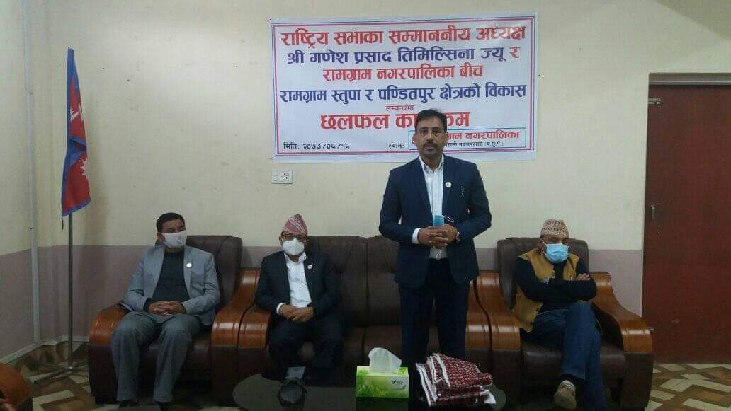देशबन्धु यादव /नवलपरासी रामग्राम स्तुप र पण्डितपुर क्षेत्रको विकासका लागी रामग्राम नगरपालिकाका म मेयर नरेंद्र कुमार गुप्ता र राष्ट्रीय सभाका अध्यक्ष माननिय गणेश प्रसाद तिमिल्सिना संग छलफल सम्पन्न भयो । यस छलफलको अवसरमा उपमेयर रम्भा कुवंर ,प्रमुख प्रशासकीय अधिकृत राजेश पंथी ,प्रजिअ सागरमणि पाठक, उद्योग वाणिज्य संघ नवलपरासीका अध्यक्ष केशव भण्डारी, उपाध्यक्ष राजेश गुप्ता , नागरिक समाज का अध्यक्ष कैलाश ठाकुर, लुम्बिनी गार्डेन फाउंडेशन का अध्यक्ष गोविन्द सुबेदी , रामग्राम नगरपालिका का वडा अध्यक्ष का साथै राजनीतिक दलका जनप्रतिनिधि हरुको गरिमामय उपस्थिति रहेको थियो । राष्ट्रिय दैनिक राष्ट्रिय दैनिक एक लोकप्रिय नेपाली समाचार पोर्टल हो। हामी सत्य तथ्य निश्पक्ष र सन्तुलित समाचार सम्प्रेषण गर्ने तर्फ उद्दत छौँ । हाम्रा टोल,समाज, शहर वा आम जनताका चुलो चौको देखि सदन सम्म अथवा समाजका उदाहरणीय ब्यक्ति, रास्ट्रका पहरेदार हरेक बिषय हाम्रा समाचारका श्रोत हुन् । आवाज बिहिनहरुको आवाजमा साथ अनि सरकारको बेथितिमा हाम्रो निगरानी हुनेछ । हामी राजनितीको रंग भर्दैनौं तर राजनितीको चेतना अवश्य भर्ने छौं ।