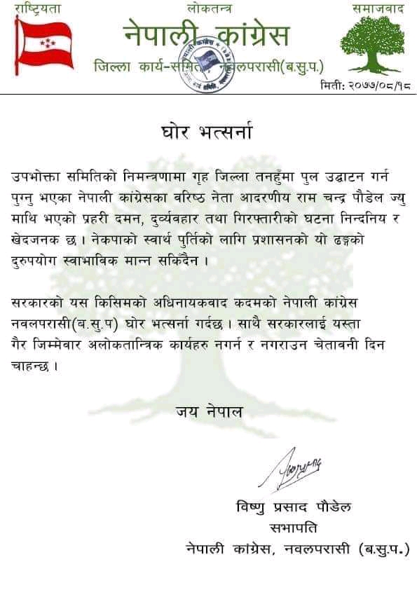 उमेश बि.क / नवलपरासी ,१८ मंसिर काङ्ग्रेस बरिस्ठ नेता रामचन्द्र पौडेलमाथिको दुर्व्यवहार प्रती नेपाली काङ्ग्रेस जिल्ला कार्यसमिति नवलपरासीद्वारा घाेर भर्त्सना गरिएको छ। गृहजिल्ला तनहुँमा पुल उद्घाटन गर्न गएका नेता पौडेलसहित नेता–कार्यकर्तामाथि भएको धरपकडको घटना र प्रहरी दमन ,दुर्ववहार आपत्तिजनक र निन्दनीय भएको भन्दै कांग्रेस नवलपरासीले घाेर भर्त्सना गरेको जिल्ला सभापति बिष्णु पाैडेलले जानकारी दिनुभएको छ। नेकपाकाे स्वार्थ पुर्तिकाे लागि प्रशासनको याे दुरुपयोग स्वभाविक मान्न सकिन्न ,सरकारकाे यस किसिमको अधिनायकवाद कदमकाे नेपाली काङ्ग्रेस बर्दघाट सुस्ता पश्चिम नवलपरासी सभापति पाैडेलले भर्त्सना गर्नुभएको छ। साथै सरकारले यस्ता गैर जिम्मेवार अलाेकतान्त्रिक कार्यहरु नगर्न गराउन चेतावनी समेत दिनु भएको हाे। राष्ट्रिय दैनिक राष्ट्रिय दैनिक एक लोकप्रिय नेपाली समाचार पोर्टल हो। हामी सत्य तथ्य निश्पक्ष र सन्तुलित समाचार सम्प्रेषण गर्ने तर्फ उद्दत छौँ । हाम्रा टोल,समाज, शहर वा आम जनताका चुलो चौको देखि सदन सम्म अथवा समाजका उदाहरणीय ब्यक्ति, रास्ट्रका पहरेदार हरेक बिषय हाम्रा समाचारका श्रोत हुन् । आवाज बिहिनहरुको आवाजमा साथ अनि सरकारको बेथितिमा हाम्रो निगरानी हुनेछ । हामी राजनितीको रंग भर्दैनौं तर राजनितीको चेतना अवश्य भर्ने छौं ।