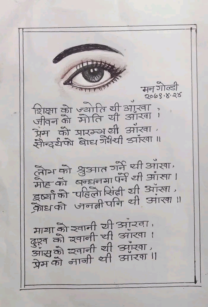 शिक्षाको ज्योति यी आँखा । जीवनको मोति यी आँखा ।। प्रेमको प्रारम्भ यी आँखा । सौन्दर्यको बोध गर्न यी आँखा ॥ लोभको शुआत गर्ने यी आँखा । मोहको बन्धनमा पर्ने यी आँखा ।। इर्ष्याको पहिलो सिंढी यी आँखा। क्रोधको जननी पनि यी आँखा ।। मायाको खानी यी आँखा । दुःखको खानी यी आँखा ।। आँसुको खानी यी आँखा। प्रेमको नानी यी आँखा ॥ मन गोल्डी २०७९ साउन २४ गते राष्ट्रिय दैनिक राष्ट्रिय दैनिक एक लोकप्रिय नेपाली समाचार पोर्टल हो। हामी सत्य तथ्य निश्पक्ष र सन्तुलित समाचार सम्प्रेषण गर्ने तर्फ उद्दत छौँ । हाम्रा टोल,समाज, शहर वा आम जनताका चुलो चौको देखि सदन सम्म अथवा समाजका उदाहरणीय ब्यक्ति, रास्ट्रका पहरेदार हरेक बिषय हाम्रा समाचारका श्रोत हुन् । आवाज बिहिनहरुको आवाजमा साथ अनि सरकारको बेथितिमा हाम्रो निगरानी हुनेछ । हामी राजनितीको रंग भर्दैनौं तर राजनितीको चेतना अवश्य भर्ने छौं ।