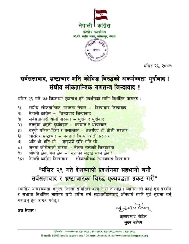 उमेश बि.क/ नवलपरासी ,२८ मंसिर नेपाली कांग्रेस जिल्ला कार्यसमिति पश्चिम नवलपरासीले सरकार विरुद्ध गर्न लागेको बृहत प्रर्दशनको तयारी अन्तिम चरणमा पुगेको छ । सरकारको अधिनायकवादी र दमनकारी ब्यवहारविरुद्ध यही मंसिर २९ गते केन्द्रिय कार्यक्रम अनुसार नवलपरासी लगायत देशभर कांग्रेसले प्रर्दशन गर्न लागेको हो । नवलपरासीमा पनि बृहत प्रर्दशनसहित वर्तमान सरकारको कार्यशैलीको भण्डाफोर गर्ने तयारी भइरहेको नेपाली कांग्रेस नवलपरासीकाे सभापति बिष्णु पाैडेलले जानकारी दिनुभयो । उक्त दिन बिहान ११ बजे नेपाली कांग्रेस नवलपरासीको कार्यालय परासीबाट प्रर्दशन सुरु भएर सदरमुकामको विभिन्न भागको परिक्रमा गरिने उहाँले बताउनु भयो । उक्त प्रर्दशनमा सहभागी जिल्लाका विभिन्न स्थानमा रहेका नेपाली कांग्रेसका कार्यकर्ता,भातृसंगठन,सुबेच्छुक तथा सर्बसाधारण लगायत सबैलाई अपिल गरिएको सभापति पाैडेलको भनाई छ । ‘वर्तमान अधिनायकवादी सरकारले सर्बसाधारण नागरिकलाई अनेक दुःख दिइरहेको छ । यसका विरुद्ध सबै नागरिक सडकमा उत्रिएर सरकारको भण्डाफोर गर्न जरुरी छ,’ उहाँले भन्नुभयो । प्रर्दशनलाई लक्षित गरेर कांग्रेस नवलपरासीले जिल्ला कार्यसमिति, पदाधिकारी, तीन वटै क्षेत्रका कार्यसमिति, पदाधिकारी, भातृ तथा शुभेच्छुक संगठनका प्रतिनिधी लगायतसँग निरन्तर छलफल गर्दै आएको जनाएको छ । तनहुँमा रहेको एक पुल उद्घाटन गर्न जाने क्रममा केहीदिन अघि कांग्रेसका वरिष्ठ नेता रामचन्द्र पौडेल लगायत पार्टीका नेता तथा कार्यकर्तालाई प्रहरी प्रशासनले बल प्रयोग गरेर नियन्त्रणमा लिई मुक्त गरेपछि नेपाली कांग्रेस आक्रोशित बनेको छ । राष्ट्रिय दैनिक राष्ट्रिय दैनिक एक लोकप्रिय नेपाली समाचार पोर्टल हो। हामी सत्य तथ्य निश्पक्ष र सन्तुलित समाचार सम्प्रेषण गर्ने तर्फ उद्दत छौँ । हाम्रा टोल,समाज, शहर वा आम जनताका चुलो चौको देखि सदन सम्म अथवा समाजका उदाहरणीय ब्यक्ति, रास्ट्रका पहरेदार हरेक बिषय हाम्रा समाचारका श्रोत हुन् । आवाज बिहिनहरुको आवाजमा साथ अनि सरकारको बेथितिमा हाम्रो निगरानी हुनेछ । हामी राजनितीको रंग भर्दैनौं तर राजनितीको चेतना अवश्य भर्ने छौं ।