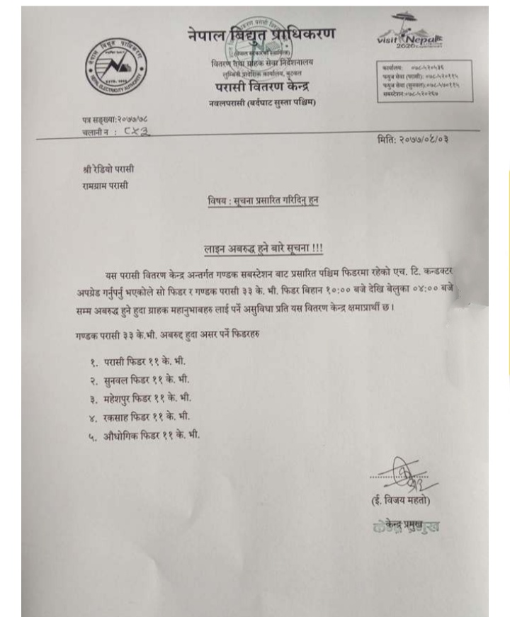 नवलपरासी / ४ पुस पश्चिम नवलपरासीमा शनिबार करिब ६ घण्टा बिधुत अबरुद्ध हुने भएको छ । नेपाल विधुत प्राधिकरण, परासीले शुक्रबार सुचना जारी गर्दै शनिबार बिहान १० बजेदेखी साझँ ४ बजेसम्म विधुत अबरुद्ध हुने जनाएको छ । परासी वितरण केन्द्र अन्तर्गतको गण्डक सबस्टेशनबाट प्रसारित पश्चिम फिडरमा रहेको एच.टि.कन्डक्टर अपग्रेड गर्नुपर्ने प्राधिकरणले जानकारी दिएको छ । गण्डक परासी ३३ के.भी अबरुद्ध हुँदा परासी पिडर ११ के.भी, सुनवल फिडर ११ के.भी, महेशपुर फिडर ११ के.भी, रक्साह फिडर ११ के.भी र औधोगीक फिडर ११ के.भीमा असर पर्ने छ । तसर्थ बिधुत अबरुद्ध हुने जनाएको हो । तसर्थ ग्राहकहरुलाई पर्ने असुविधा प्रति क्षमाप्रार्थी रहेको प्राधिकरणले जनाएको छ । राष्ट्रिय दैनिक राष्ट्रिय दैनिक एक लोकप्रिय नेपाली समाचार पोर्टल हो। हामी सत्य तथ्य निश्पक्ष र सन्तुलित समाचार सम्प्रेषण गर्ने तर्फ उद्दत छौँ । हाम्रा टोल,समाज, शहर वा आम जनताका चुलो चौको देखि सदन सम्म अथवा समाजका उदाहरणीय ब्यक्ति, रास्ट्रका पहरेदार हरेक बिषय हाम्रा समाचारका श्रोत हुन् । आवाज बिहिनहरुको आवाजमा साथ अनि सरकारको बेथितिमा हाम्रो निगरानी हुनेछ । हामी राजनितीको रंग भर्दैनौं तर राजनितीको चेतना अवश्य भर्ने छौं ।