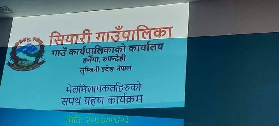 तुलसी राम पौडेल /सियारी ,पौष ४ रुपन्देहीको सियारी गाउपालिकामा सामुदायिक मेलमिलाप कर्ताहरुको सपथ ग्रहण एव प्रमाणपत्र वितरण कार्यक्रम शुक्रबार सम्पन्न भयो ।प्रदेश सासद तुलसी प्रसाद चौधरीले गाउपालिका अन्तरगतका ४१ जना सामुदायिक मेलमिलापकर्ताहरुलाइ सपथ गराउनुको साथै प्रमाणपत्र प्रदान गर्नुभयो ।त्यसै अवसरमा उहाले समुदायका धेरै भन्दा धेरै मुद्दाहरु समुदायमा नै मिलापत्र गराउन मेलमिलाप कर्ताहरुको महत्त्वपूर्ण भुमिका रहने बताउनु भयो ।गाउपालिका अध्यक्ष अयोध्या प्रसाद थारुले जनताको सेवा गर्ने हामिलाइ प्राप्त भएको अवसरलाई जिम्मेवारीका साथ भुमिका निभाउनु पर्ने बताउनु भयो । न्याय समिति संयोजक एव गाउपालिका उपाध्यक्ष अमृता गुरुङको अध्यक्षता, प्रदेश सासद तुलसी प्रसाद चौधरीको प्रमुख आतिथ्यता, गाउँ पालिका अध्यक्ष अयोध्या प्रसाद थारुको विशिस्ट आतिथ्यतामा सम्पन्न कार्यक्रममा वडा नम्बर ५ का वडा अध्यक्ष थम्मन बहादुर पौडेल ,प्रमुख प्रशासकिय अधिकृत मीन प्रसाद भट्टराई ,अधिवक्ता सुर्यराज अधिकारी ,मेलमिलाप कर्ता सम्झना क्षेत्री लगायतले शुभकामना मन्तव्य दिनुभएको थियो । न्यायसमिती सदस्य बिष्णु रायमाझीको स्वागत मन्तव्य रहेको कार्यक्रमको संचालन गाउपालिका प्रशासन शाखाका नायब सुब्बा चिरञ्जीवी गौतमले गर्नुभएको थियो राष्ट्रिय दैनिक राष्ट्रिय दैनिक एक लोकप्रिय नेपाली समाचार पोर्टल हो। हामी सत्य तथ्य निश्पक्ष र सन्तुलित समाचार सम्प्रेषण गर्ने तर्फ उद्दत छौँ । हाम्रा टोल,समाज, शहर वा आम जनताका चुलो चौको देखि सदन सम्म अथवा समाजका उदाहरणीय ब्यक्ति, रास्ट्रका पहरेदार हरेक बिषय हाम्रा समाचारका श्रोत हुन् । आवाज बिहिनहरुको आवाजमा साथ अनि सरकारको बेथितिमा हाम्रो निगरानी हुनेछ । हामी राजनितीको रंग भर्दैनौं तर राजनितीको चेतना अवश्य भर्ने छौं ।