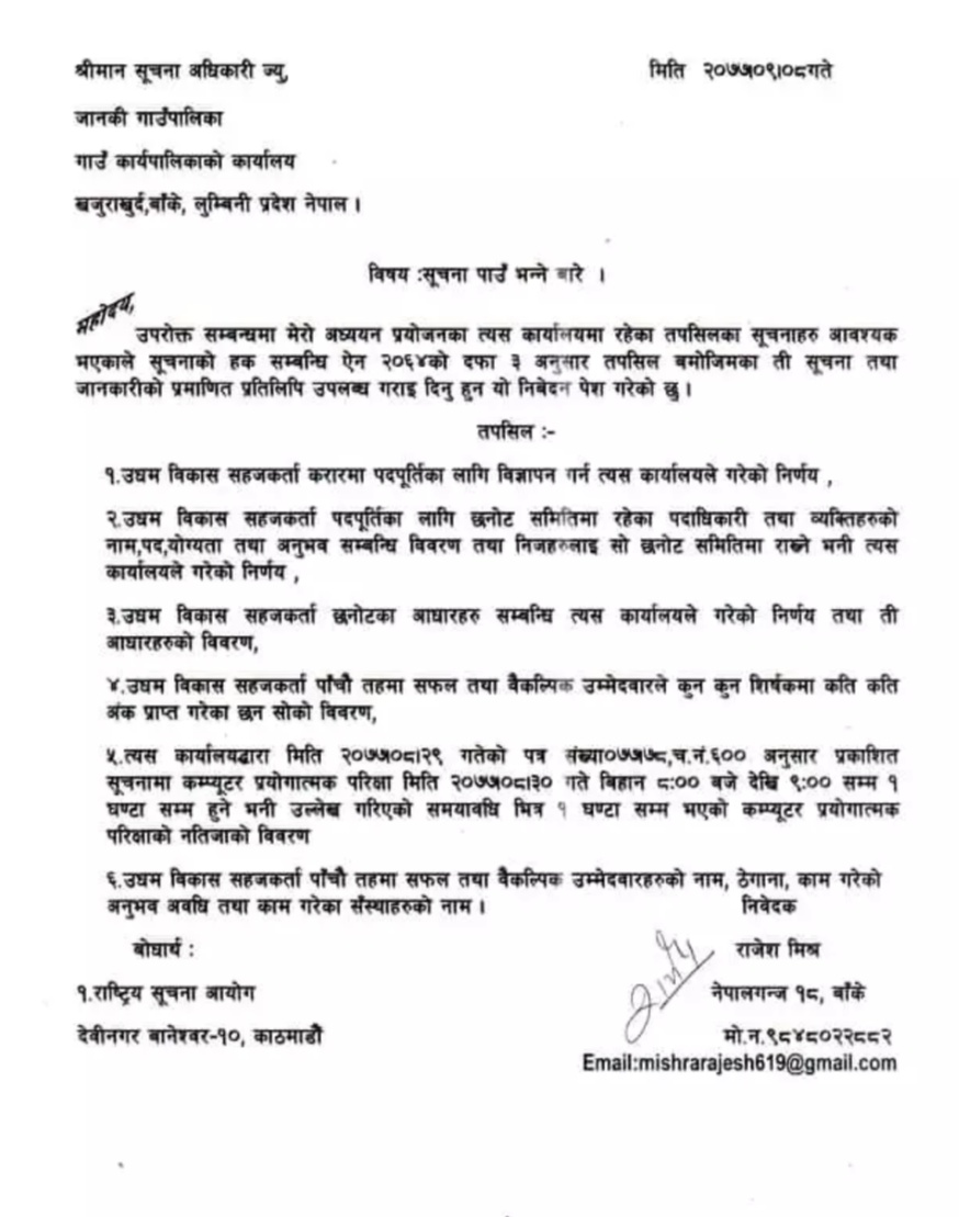 अजय पाठक / बाँके ८ पुस बाँकेको जानकी गाउँपालिका गाउँ कार्यपालिकाको कार्यालय संग उघम बिकास सम्बन्धी बिस्तृत रुपमा सूचना माग गरिएको छ । नील खबर अन्लाईनका बरिस्ठ सल्लाहकार राजेश मिश्रले गाउँ कार्यपालिका लुम्बिनी प्रदेशलाई सम्बोधन गर्दै आफ्नो अध्ययन प्रयोजनका लागि आवश्यक जानकारीको प्रमार्णित प्रतिलिपी उपलब्ध गराइ दिन बुधबार गाउँपालिकालाई निवेदन पेस गर्नु भएको हो । सूचनाको हक ऎन २०६४ को दफा ३ अनुसार कुनै पनि नागरिकले सम्बन्धित सरकारी नियम बमोजिम सूचना जान्न सरकारले हक र अधिकार सुनिश्चित गरेको छ । सोही बमोजिम उहाँले माग गरेका तपसिल बमोजिमको कागज उपलब्ध गराउन निवेदन गर्नु भएको हो । माग गरिएका कागजात निम्न अनुसारका छन : १) उघम बिकास सहजकर्ता करारमा पदपूर्तिका लागी बिज्ञापन गर्न त्यस कार्यालयले गरेको निर्णय, २) उघम बिकास सहजकर्ता पदपूर्तिका लागी छनोट समितिमा रहेका पदाधिकारी तथा व्यक्तिहरुको नाम, पद, योग्यता तथा अनुभव सम्बन्धि विवरण तथा निजहरुको सो छनोट समिती मा राख्ने भनी त्यस कार्यालयले गरेको निर्णय ३) उघम बिकास सहजकर्ता छनोट आधारहरु सम्बन्धि त्यस कार्यालयले गरेको निर्णय तथा ती आधारहरुको बिवरण ४) उघम बिआस सहजकर्ता पाँचौ तहमा सफल तथा बैकल्पिक उम्मेदवार कुन कुन शिर्षकमा कति कति अन्क प्राप्त गरेका छन सोको विवरण ५) त्यस कार्यालयद्वारा मिति २०७७/०८/२९ गतेको पत्र संख्या ०७७/७८ चलानी नम्बर ६०० अनुसार प्रकाशीत सूचनामा कम्पयुटर प्रयोगात्मक परिक्षा मिति ०७७/०८/३० गते बिहान ८:०० बजे देखि ९:०० सम्म १परिक्षाको नतिजाको विवरण ६) उघम बिकास सहजकर्ता पाँचौ तहमा सफल तथा बैकल्पिक उम्मेदवारहरुको नाम ठेगान, काम गरेको अनुभव अवधि तथा काम गरेको संस्थाहरुको नाम लगायतको सूचना पाउअ भन्ने बारे निवेदन गर्नु भएको हो राष्ट्रिय दैनिक राष्ट्रिय दैनिक एक लोकप्रिय नेपाली समाचार पोर्टल हो। हामी सत्य तथ्य निश्पक्ष र सन्तुलित समाचार सम्प्रेषण गर्ने तर्फ उद्दत छौँ । हाम्रा टोल,समाज, शहर वा आम जनताका चुलो चौको देखि सदन सम्म अथवा समाजका उदाहरणीय ब्यक्ति, रास्ट्रका पहरेदार हरेक बिषय हाम्रा समाचारका श्रोत हुन् । आवाज बिहिनहरुको आवाजमा साथ अनि सरकारको बेथितिमा हाम्रो निगरानी हुनेछ । हामी राजनितीको रंग भर्दैनौं तर राजनितीको चेतना अवश्य भर्ने छौं ।