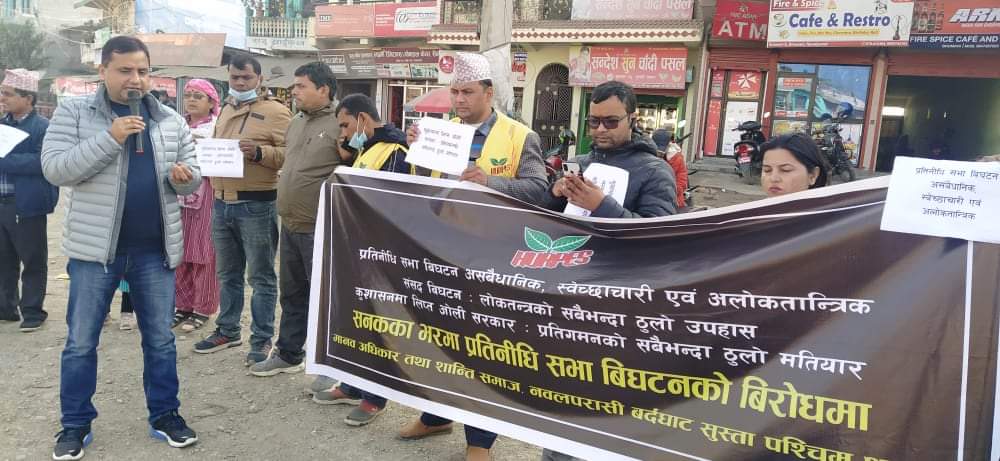 प्रकाश न्यौपाने / नवलपरासी १० पौष पश्चिम नवलपरासीमा मानव अधिकार तथा शान्ति समाज नवलपरासी जिल्ला शाखाले आज बर्तमान सरकारका प्रधानमन्त्री मन्त्रीले ससद विघटनका बिरुद्ध आज प्रदर्शन गरेको छ । मानव अधिकार तथा शान्ति समाजका बरिस्ठ उपसभापति गोबिन्द खनालले प्रधानमन्त्री ओलिले पार्टी भित्रको भागबन्डाको फोहोरी किचलो दबाउन तथा भ्रष्टाचारि छवि छल्न संबिधानको घाँटी निमोठेर अपराध गरेको बताउनुभयो। कार्यक्रममा बोल्दै खनालले बर्तमान सरकारले प्रतिनिधि सभाको विघटन गरेर असबैधानिक काम गरेको र यसले लोकतन्त्रलाई खतरामा परेको बताउनु भयो । अहिले प्रधानमन्त्री मन्त्रीले चालेको कदमले देश गम्भीर मोडमा पुगेको बताउदै उहाले जनताको मर्म अनुसारको काम नभएको बताउनु भयो । मानव अधिकार तथा शान्ति समाजका केन्द्रिय सदस्य मोहन प्रसाद बि.क, सल्लाहकार माधव पाण्डे पत्रकार महासघ नवलपरासीका अध्यक्ष हरि शर्मा लगायतले बोल्दै देशले हालसम्म प्राप्त गरेका उपलब्धिहरु गुम्ने खतरा रहेको बताउनु भयो । मानव अधिकार तथा शान्ति समाजका जिल्ला अध्यक्ष सन्तोष अधिकारीको अध्यक्षतामा भएको कार्यक्रमको औचित्य प्रकाश न्यौपानेले पर्नु भएको थियो भने कार्यक्रमको संचालन सचीव गणेश न्यौपानेले गर्नु भएको छ । राष्ट्रिय दैनिक राष्ट्रिय दैनिक एक लोकप्रिय नेपाली समाचार पोर्टल हो। हामी सत्य तथ्य निश्पक्ष र सन्तुलित समाचार सम्प्रेषण गर्ने तर्फ उद्दत छौँ । हाम्रा टोल,समाज, शहर वा आम जनताका चुलो चौको देखि सदन सम्म अथवा समाजका उदाहरणीय ब्यक्ति, रास्ट्रका पहरेदार हरेक बिषय हाम्रा समाचारका श्रोत हुन् । आवाज बिहिनहरुको आवाजमा साथ अनि सरकारको बेथितिमा हाम्रो निगरानी हुनेछ । हामी राजनितीको रंग भर्दैनौं तर राजनितीको चेतना अवश्य भर्ने छौं ।