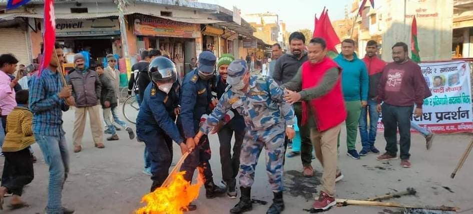 कृष्णनगर /१० पुस जनता समाजबादी पार्टी (जसपा)ले शुक्रबार कपिलवस्तुका १० वटै पालिकामा प्रदर्शन गरेको छ । प्रधानमन्त्री केपी शर्मा ओलीले संविधान विपरित संसद विघटन गरेपछि चरणवद्ध आन्दोलनमा उत्रिएको जसपाले शुक्रबार जिल्लाब्यापी प्रदर्शन गरेको हो । यसैक्रममा कृष्णनगर नगरपालिकामा पनि प्रदर्शन भएको छ । प्रदर्शनकारीले राष्ट्रपति विद्यादेवी भण्डारी र प्रधानमन्त्री केपी शर्मा ओलीको पुत्ला दहन गरेका थिए । केहीछिन जुलुस निकालेका जसपाका नेता र कार्यकर्ताले राष्ट्रपति विद्यादेवी भण्डारी र प्रधानमन्त्री केपी शर्मा ओलीको पुत्ला दहन पछि कृष्णनगरको गोलघर चोकमा भेला भएका थिए । जसपाका नेता अकरम पठानले बोल्दै भनेकी प्रधानमंत्री केपी ओलीले संसद विघटन गरेर संविधान विपरित काम गरेको बताए । साथै जसपाको बिरोध कार्यक्रममा सहभागी हुन समेत आग्रह गरे। जसपाको आन्दोलनमा प्रहरीले हस्तक्षेप गरेकोमा विरोध गरेका थिए । विरोध प्रदर्शनमा बृजेश गुप्ता,अकिल अहमद, बजरंगी गुप्ता ,इंद्रदेव चौधरी जीवन श्रीवास्तव गोपाल प्यारे चंदेल ,शम्भू पांडेय, निखिल पाठक,सलमान अरशद इदरीसी,सहित दर्जनौं व्यक्तिको उपस्थित रहेको थियो।लुम्बिनी प्रदेशको सबै जिल्लामा पुतला दहन कार्यक्रम भयको जानकारी प्रदेश प्रवक्ता अकरम पठान ले दिनु भयो। राष्ट्रिय दैनिक राष्ट्रिय दैनिक एक लोकप्रिय नेपाली समाचार पोर्टल हो। हामी सत्य तथ्य निश्पक्ष र सन्तुलित समाचार सम्प्रेषण गर्ने तर्फ उद्दत छौँ । हाम्रा टोल,समाज, शहर वा आम जनताका चुलो चौको देखि सदन सम्म अथवा समाजका उदाहरणीय ब्यक्ति, रास्ट्रका पहरेदार हरेक बिषय हाम्रा समाचारका श्रोत हुन् । आवाज बिहिनहरुको आवाजमा साथ अनि सरकारको बेथितिमा हाम्रो निगरानी हुनेछ । हामी राजनितीको रंग भर्दैनौं तर राजनितीको चेतना अवश्य भर्ने छौं ।