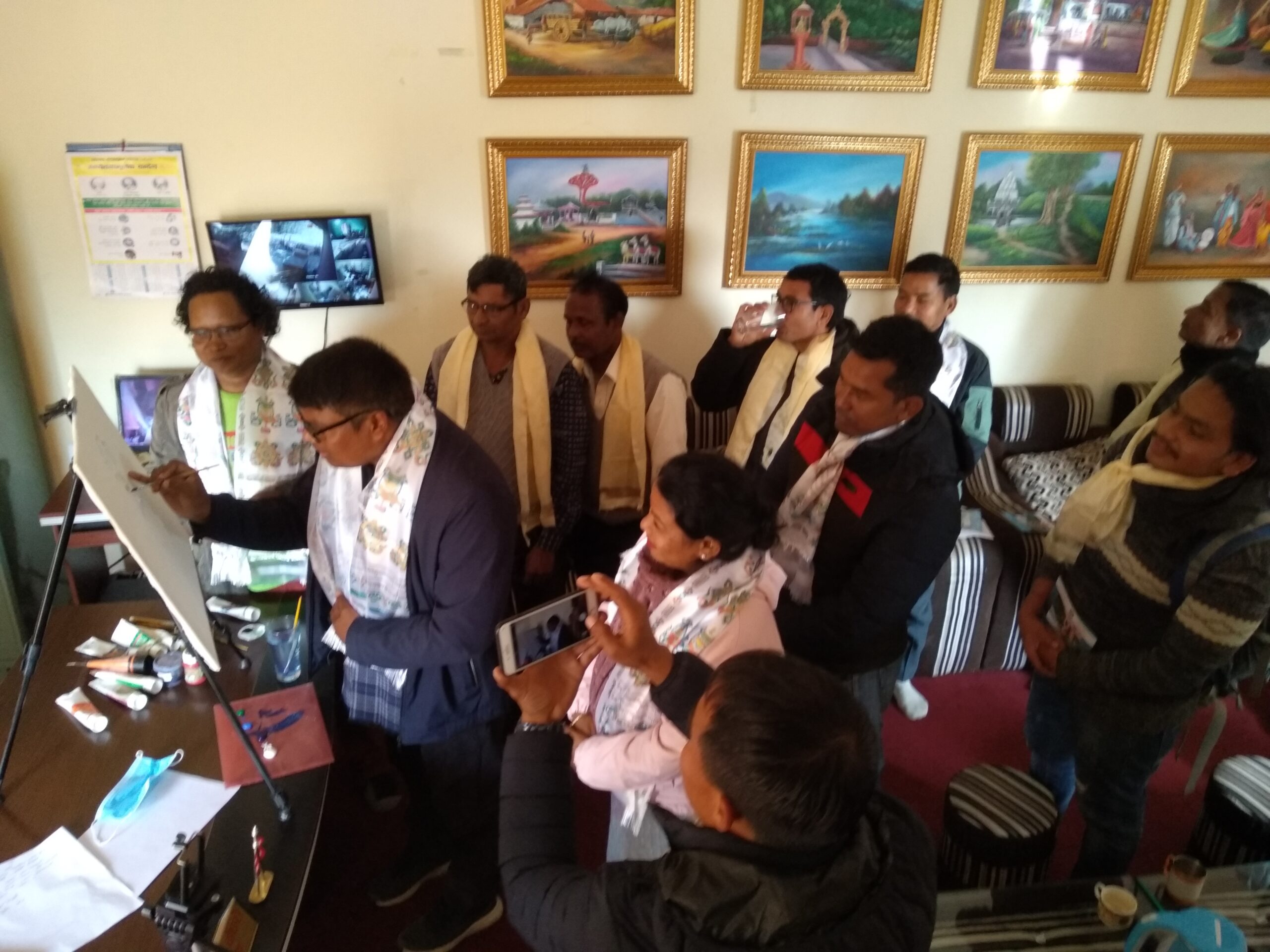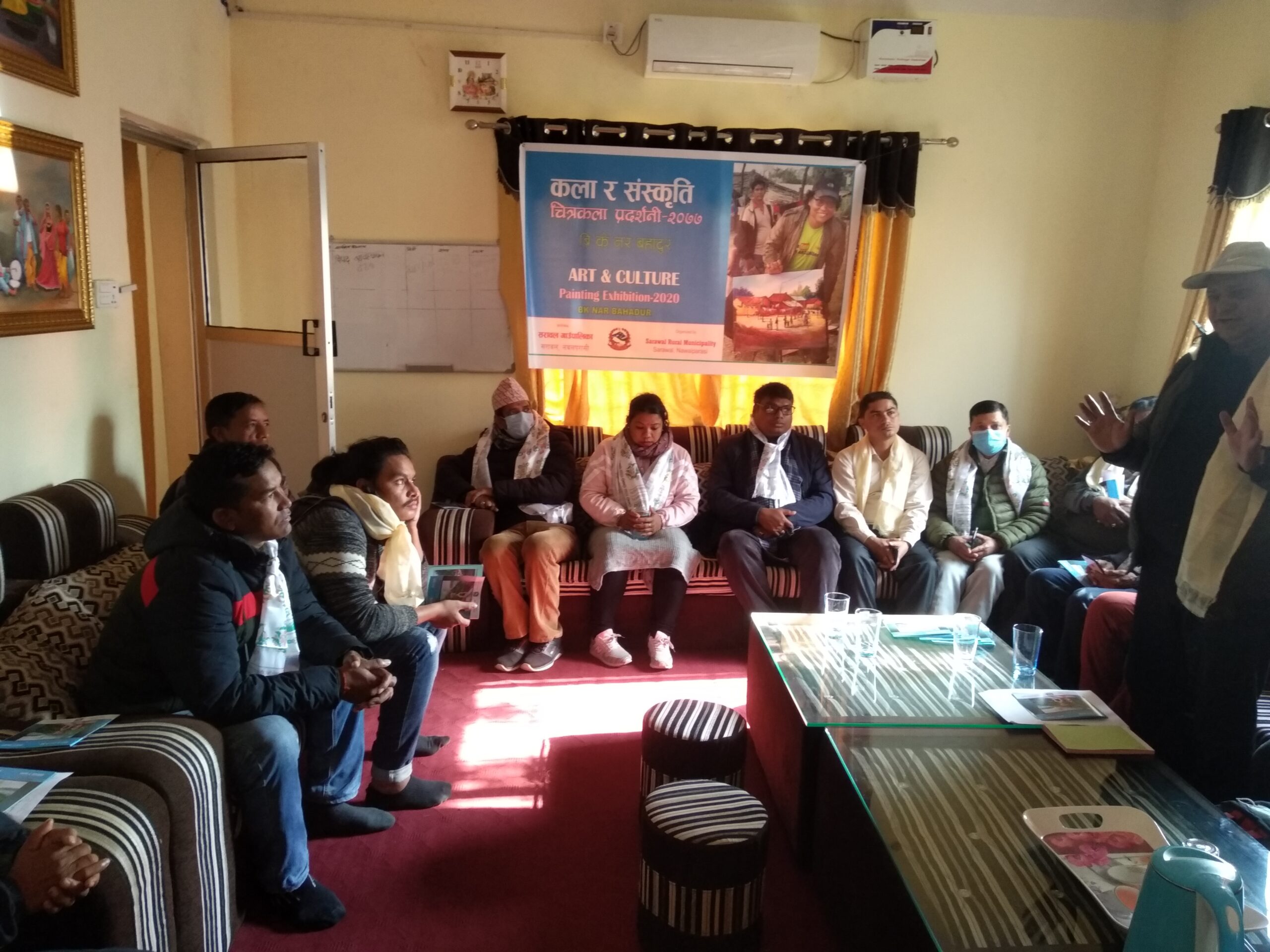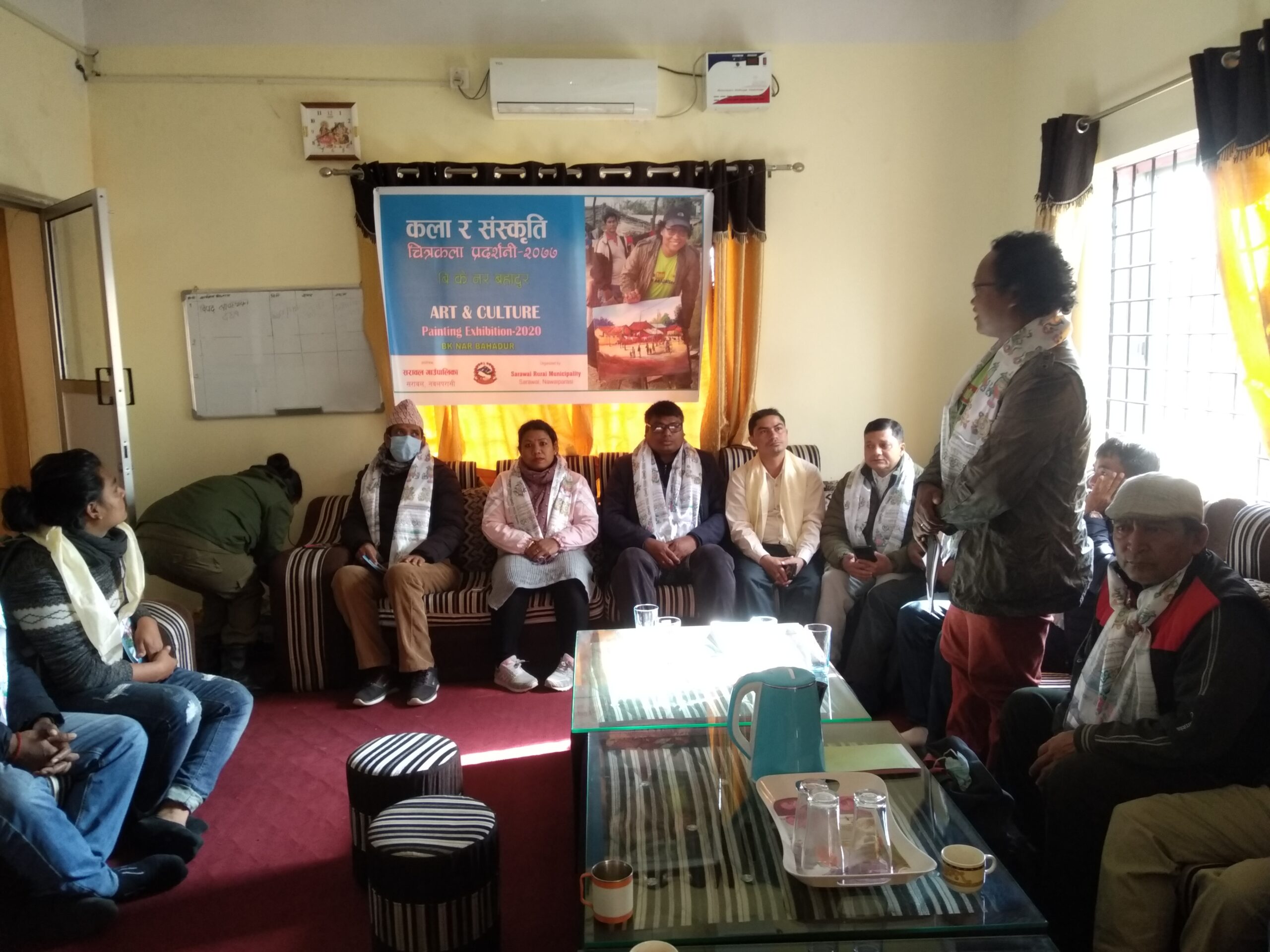 उमेश बि.क / नवलपरासी , १० पुस पश्चिम नवलपरासीको सरावल गाउँपालिकामा गाउँपालिका अन्तर्गतका पर्यटकीय क्षेत्रलाई पर्यटन प्रबर्द्धन गर्ने उद्देशकाे साथ चित्रकला प्रदर्शनी गरिएको छ। सरावल गाउँपालिकाकाे अायाेजनामा गाउँपालिका उपाध्यक्ष उत्तमा रायको अध्यक्षता तथा गाउँपालिका अध्यक्ष राधेश्याम चाैधरीकाे प्रमुख अातिथ्यतामा चित्रकला प्रदर्शनी गरिएको हाे। कार्यक्रमलाई सम्बाेधन गर्दै अध्यक्ष चाैधरीले चित्रकलाले कला र कलाकारको सम्मान हुने उनले बताए।स्थानीय स्तरमा यस्ता कार्यक्रमले गाउँघरमा लुकेर बसेको प्रतिभालाई प्रस्फुटन गराउन सक्ने उनले धारणा राखे। कलाकार देशका गहना भएको भन्दै चित्रकारको सम्मान र सिर्जनाको उचित विकास हुनुपर्नेमा उनले जोड दिए। गाउँपालिकाले पनि कलाकारको खोजी उनीहरुलाई प्रोत्साहन गर्नलाई विभिन्न कार्यक्रमको आयोजना गरिरहेकाे बताए। चित्रकार नर बहादुर सरावलकाे गाैरभ र गहना रहेको हुनाले वहाँले गाउँपालिका अन्तर्गतको कलासंस्कृति र पर्यटकीय ठाउँलाई अाफ्नाे कलाकाे माध्यमले अाफ्नाे नाम अमर गर्नुभएको छ । र वहाँकाे कामले पालिका अन्तर्गत पर्यटकीय क्षेत्र संरक्षण भएको बताउनु भएको हाे। यस्ता कलाकाे माध्यमबाट पालिकालाई कला र संस्कृतिको संरक्षण गरेर यसको व्यापक प्रचारप्रसार गर्दै पालिकालाई विश्वमा चिनाउने कुरामा जाेड दिनुभएको हाे । त्यस्तै गाउँपालिका उपाध्यक्ष रायले सरावलकाे वस्तिभित्रका हस्ति चित्रकार नर बहादुर रहेको बताउनु भएको हाे। वडा नम्बर ३ कलाकाे धनी रहेको बताउदै चित्रकार नर बहादुरले प्रधानमन्त्री केपि शर्मा अाेलिबाट सम्मान भएको याे एउटा गाैरभकाे कुरा रहेको बताउनु भएको हाे। अबकाे युवा यस्ता हस्तिबाट वहाँहरुकाे कला सिक्दै समग्र सरावल गाउँपालिकाकाे नाम अगाडि बढाउनुपर्ने कुरामा जाेड दिनुभएको हाे। त्यस्तै प्रमुख प्रशासकीय अधिकृत बुद्ध प्रकास पाैडेलले गाउँपालिका विभिन्न विकासकाे कार्य गर्दै जादा सरावल गाउँपालिकाका पर्यटकीय र सांस्कृतिक सम्पत्तिलाई नर बहादुर बि.क ले प्रदर्शन गरेकाे याे पनि एउटा बिकास रहेको कुरामा जाेड दिनु भएको हाे। थारु संस्कृति ,यादव फरुवाहि नाच तथा पर्यटकीय क्षेत्रकाे विकास गर्दै गाउँपालिका चाैतर्फिक विकासमा अगाडि बढेको कुरामा जाेड दिनुभएको थियाे। त्यस्तै बरिस्ठ चित्रकार मन गाेल्डिले सरावल गाउँपालिका उदाहरणीय काम गरिएको प्रशंसा ब्यक्त गर्दै कलाकार नर बहादुर सरावलकाे गाैरभ रहेको बताउनु भएको हाे। चित्रकला प्रदर्शनीमा सरावल २ जावाकाे पर्यटकीय क्षेत्र काेलवृक्ष ,अत्रहटीकाे शिवालय मन्दिर,गाेबरहियाकाे काेटहि मन्दिर,बर्दघाटेकाे बर्दघाटे कालिका मन्दिर ,सिमसार क्षेत्र ,स्था