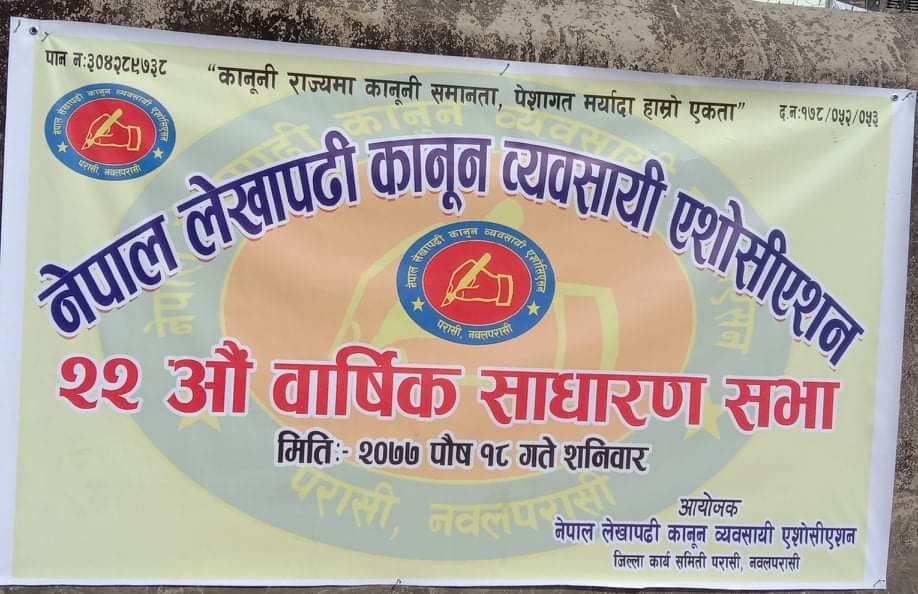 ज्ञानेश्वर सहानी / नवलपरासी / १८ पुष । पश्चिम् नवलपरासीको नेपाल लेखापढी कानुन व्यवसायी एसोसिएसन जिल्ला कार्य समिति परासी नवलपरासीको २२ औं वार्षिक साधारणसभा आज सम्पन्न भएको छ । नेपाल लेखापढी कानुन व्यवसायी एसोसिएसन जिल्ला कार्य समिति परासी नवलपरासीले गत आर्थिक वर्ष ०७६/०७७ मा २१ लाख ६७ हजार २७० रुपैयाको कुल कारोबार गरेको छ । नेपाल लेखापढी कानुन व्यवसायी एशोसिएशन जिल्ला कार्य समिति परासी नवलपरासीका अध्यक्ष चाैथी प्रसाद काेहारको अध्यक्ष्ाता तथा लुम्बिनी प्रदेशसभा सदस्य मा० देवी प्रसाद अर्यालको प्रमुख अथितिक्ता तथा लुम्बिनी प्रदेशसभा सदस्य अर्जुन बहादुर क्षेत्रीको विशिस्ट अथितिक्ता एवम् एसोसिएसनका पुर्ब अध्यक्ष रामवृक्ष यादव , पुर्बी केन्द्रीय सदस्य तथा वर्तमान सल्लाहकार सन्योजक रामनाथ शर्मा पाैडेल, संस्थापक अध्यक्ष जीवन कुमार भट्ट, पुर्व अध्यक्ष शत्रुधन सापकोटा , विशिस्ट लेखापढि व्यवसायी माधव सिह भण्डारी तथा पत्रकार ज्ञानेश्वर सहानी लगायतको व्यक्ति अतिथिक्ता रहेको थियो भने स्वागत मन्तव्य संस्थाका उपाध्यक्ष उमाशंकार गिरि ले राख्नु भएको थियो भने कार्यक्रम सन्चालन केशव प्रसाद अर्याल तथा प्रगति प्रतिबेदन सचिवले प्रस्तुत गरेका थिए । राष्ट्रिय दैनिक राष्ट्रिय दैनिक एक लोकप्रिय नेपाली समाचार पोर्टल हो। हामी सत्य तथ्य निश्पक्ष र सन्तुलित समाचार सम्प्रेषण गर्ने तर्फ उद्दत छौँ । हाम्रा टोल,समाज, शहर वा आम जनताका चुलो चौको देखि सदन सम्म अथवा समाजका उदाहरणीय ब्यक्ति, रास्ट्रका पहरेदार हरेक बिषय हाम्रा समाचारका श्रोत हुन् । आवाज बिहिनहरुको आवाजमा साथ अनि सरकारको बेथितिमा हाम्रो निगरानी हुनेछ । हामी राजनितीको रंग भर्दैनौं तर राजनितीको चेतना अवश्य भर्ने छौं ।