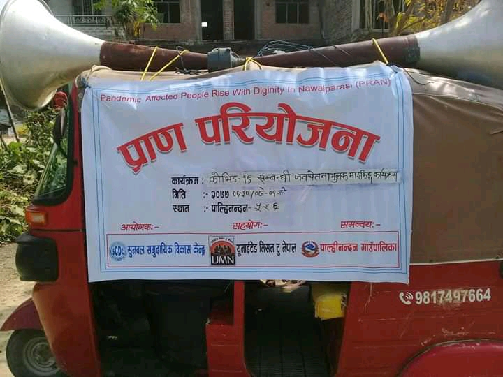 उमेश बि.क/ नवलपरासी,२ कार्तिक पश्चिम् नवलपरासीकाे पाल्हिनन्दन गाउँपालिकामा सुनवल सामुदायिक बिकास केन्द्रले कोभिड बारे जनचेतनामुलक माइकिङ कार्यक्रम सम्पन्न गरेको छ । समुदाय स्तरमा दिनानुदिन काेराेना भाइरस काेभिड १९ काे संक्रमण बढ्दै गइरहेकोले चाडपर्वलाई लक्ष्यित गर्दै पाल्हिनन्दन गाउँपालिका वार्ड न ५ र ६ काे सम्पुर्ण टाेलमा कोभिड बारे जनचेतनामुलक माइकिङ कार्यक्रम सम्पन्न गरेको हाे। सुनवल सामुदायिक बिकास केन्द्रकाे आयोजनामा तथा युनाइटेड मिसन टु नेपालकाे सहयोग र पाल्हिनन्दन गाउँपालिकाकाे समन्वयमा काेराेनाकाे लक्षण , काेराेनाबाट बच्ने उपाय तथा सावधानीकाे विषयवस्तु समेटेर जनसमुदायमा सचेतना फैलाउने उद्देश्यले माइकिङ गरिएको हो । कोरोना भाइरसबाट आफु पनि बचौ र अरुलाई पनि बचाऔँ भन्ने अभियान अन्तर्गत साबुन पानी मिचिमिचि हात धोऔँ, घर बाहिर जादा नियमित मास्कको प्रयोग गरौँ,रुघाखोकी लागेमा तथा स्वास्थ्यमा कुनै समस्या देखिए तुरुन्त अस्पतालमा जाऔँ, घरपालुवा र जंगली जनावरको पहुचबाट टाढा बसौँ, समान्य स्वास्थ्यमा समस्या देखिए पनि त्यस्ता ब्यक्तिको सम्पर्कमा नबसौँ, मासु अण्डा खानु परे राम्ररी पखाली पकाएर खाऔँ लगाएत जनचेतनामुलक भोेजपुरी भाषामा लेखिएका ब्यानर र साउण्ड रेकर्ड सहित पाल्हिनन्दनकाे वडा नं. ५ र ६ का सम्पूर्ण टाेलटाेलमा जनचेतना फैलाउने काम गरिएको सुनवल सामुदायिक बिकास केन्द्रकि अध्यक्ष सपना अधिकारी थापाले जानकारी दिनुभएको हाे। राष्ट्रिय दैनिक राष्ट्रिय दैनिक एक लोकप्रिय नेपाली समाचार पोर्टल हो। हामी सत्य तथ्य निश्पक्ष र सन्तुलित समाचार सम्प्रेषण गर्ने तर्फ उद्दत छौँ । हाम्रा टोल,समाज, शहर वा आम जनताका चुलो चौको देखि सदन सम्म अथवा समाजका उदाहरणीय ब्यक्ति, रास्ट्रका पहरेदार हरेक बिषय हाम्रा समाचारका श्रोत हुन् । आवाज बिहिनहरुको आवाजमा साथ अनि सरकारको बेथितिमा हाम्रो निगरानी हुनेछ । हामी राजनितीको रंग भर्दैनौं तर राजनितीको चेतना अवश्य भर्ने छौं ।