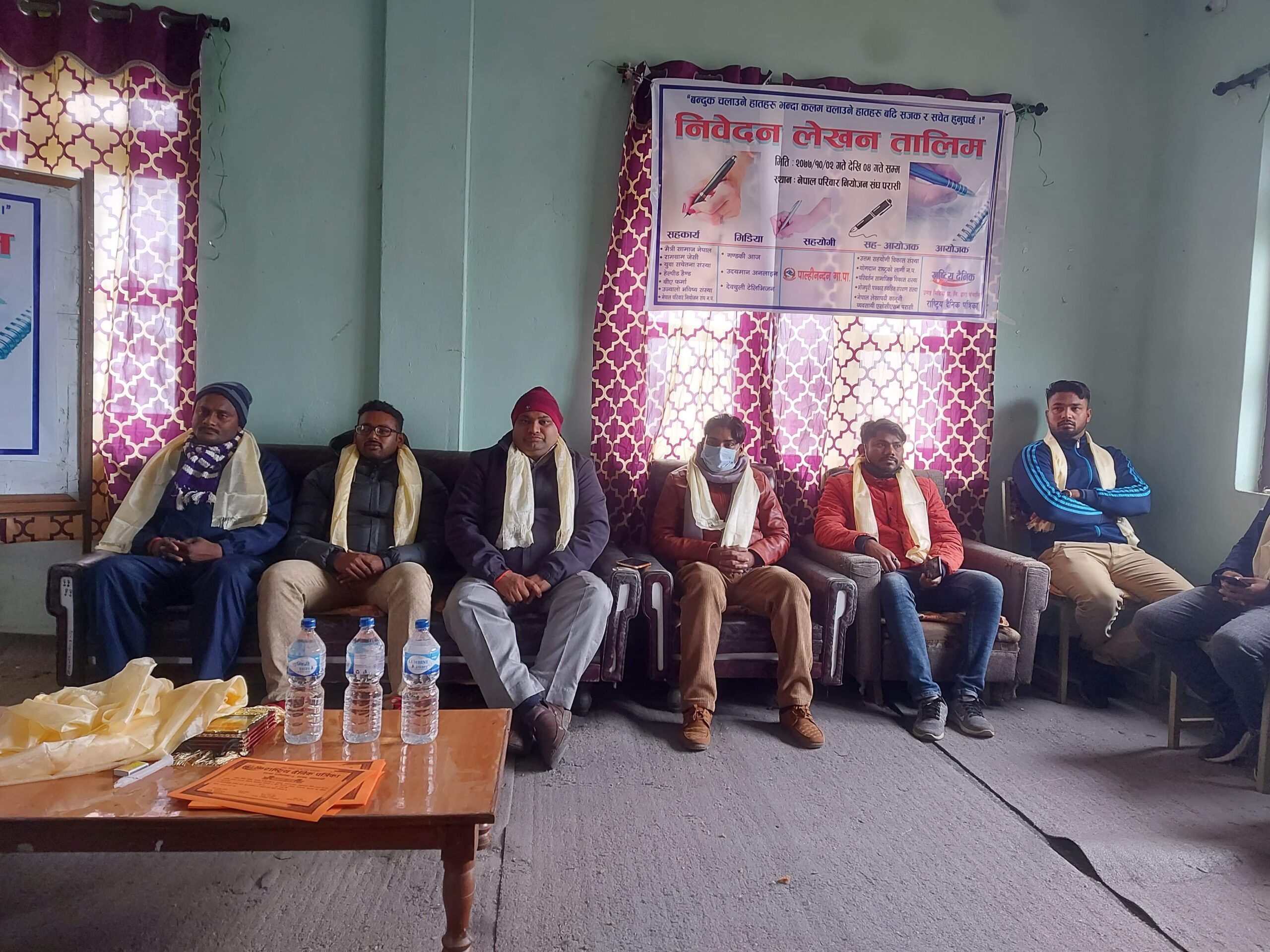रन्जीत शर्मा / नवलपरासी / ०२ माघ । पश्चिम् नवलपरासीको रामग्राम नगरपालिका वडा न- ०५ नेपाल परिवार नियोजन संघको सभाहल परासीमा ३ दिने निवेदन लेखन तालिम औपचारिक रुपमा उदघाटन भइ सुरु भएको छ् । राष्ट्रिय दैनिक पत्रीकाका सम्बादाता तथा कार्यक्रम सन्योजक बिनय मिश्रको अध्यक्ष्ाता तथा पाल्हिनन्दन गाउपालिका प्रमुख बैजु प्रसाद गुप्ता(दिपक) को प्रमुख अतिथिक्ता , नेपाल परिवार नियोजन संघ परासीका शाखा प्रवन्धक यमनाथ पौडेल, नेपाल लेखापढी कानुन व्यवसायी एसोसिएसनका अध्यक्ष चौथा प्रसार कोहार,मैत्री समाज नेपालका अध्यक्ष राकेश गुप्ता, राष्ट्रिय दैनिकका कार्यकारी प्रमुख उमेश बि०क० , बुद्ध प्रा०वि० का प्र०अ० बिनोद पाण्डे , युवा सचेतना संस्थाका अध्यक्ष इमामुल अलि,रामग्राम जेसिस-२०२० का अध्यक्ष सन्दीप अग्रहरी, समाजसेवि सम्साद अन्सारी, शिक्षक दिनेश गुप्ता, सुबाश गुप्ता ,समाजसेवि नित्यान्दन पाण्डेय,आदित्य प्रजापति बाल समुह जिल्ला सवन्य समिती नवलपरासीका भु०पुर्ब उपाध्यक्ष अमरमणी गुप्ता,राष्ट्रिय दैनिकका बजार प्रमुख ग्यानेश्वर सहानी , देवचुली टेलिभिजनका सम्बादाता पत्रकार रन्जीत शर्मा लगायतको अतिथिक्ता तथा ५० जना सहभागीको सहभागितामा उद्दघाटन कार्यक्रम सम्पन्न भएको छ । उमंग मिडिया प्रा०लि० द्वारा संचालित राष्ट्रिय दैनिक पत्रीकाको आयोजना तथा मैत्री समाज नेपाल , हेल्पिङ हेन्ड परासि ,युवा सचेतना संस्था ,उपकार समाज संस्था , योगदान रास्ट्रको लागी पश्चिम नवलपरासी शाखा ,भोजपुरी पत्रकार हकहित संरक्षण संस्था नवलपरासी,परिवर्तन सामाजिक बिकास संस्था ,उज्यालो भबिस्य संस्था ,उत्तम सहयोगी समाज संस्था र रामग्राम जेसिसको सहकार्य तथा देवचुली टेलिभिजन ,गण्डकी आज , उदयमान रास्टिय अनलाइन पत्रीकाको मिडिया सहकार्य एवम् पाल्हिनन्दन गाउपालिकाका प्रमुख बैजु प्रसाद गुप्ता, समाजसेवि सम्साद अन्सारी, गुड्डु गुप्ता लगायत सहयोग दाताहरु सहयोगमा कार्यक्रम सन्चालन भइ रहेको छ । आज तालिमको पहिलो दिन पत्रकार रन्जीत शर्मा , अधिकृत छठौ नन्दलाल प्रजापतिद्वारा कक्षा संचालन गरिएको थियो भने तालीम आज गतेबाट सुरु भइ ०४ गते समापन हुनेछ तथा प्रत्येक दिन अनुभवी लेखनदास द्वारा तालिम संचालन हुने आयोजकले जनाएको छ । राष्ट्रिय दैनिक राष्ट्रिय दैनिक एक लोकप्रिय नेपाली समाचार पोर्टल हो। हामी सत्य तथ्य निश्पक्ष र सन्तुलित समाचार सम्प्रेषण गर्ने तर्फ उद्दत छौँ । हाम्रा टोल,समाज, शहर वा आम जनताका चुलो चौको देखि सदन सम्म अथवा समाजका उदाहरणीय ब्यक्ति, रास्ट्रका पहरेदार हरेक बिषय हाम्रा समाचारका श्रोत हुन् । आवाज बिहिनहरुको आवाजमा साथ अनि सरकारको बेथितिमा हाम्रो निगरानी हुनेछ । हामी राजनितीको रंग भर्द