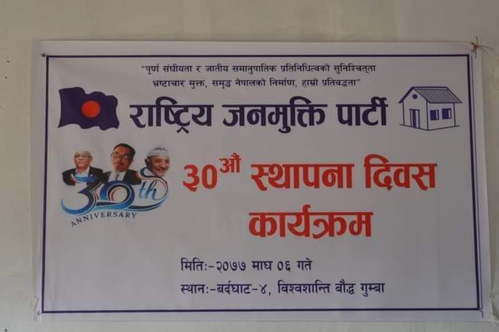 नवलपरासी /६ माघ । राष्ट्रिय जनमुक्ति पार्टी को ३०औ स्थापना दिवस बर्दघाटमा पनि भव्य रुपमा मनाएको छ । पार्टी स्थापना दिवस लाई संबोधन गर्दौ नवलपरासी जिल्ला अध्यक्ष धन बहादूर गुरुङ् ले राष्ट्र र राष्ट्रियता को लागि बैकल्पकि शक्ति को रुपमा जनमुक्ति पार्टी रहेको बताए । स्थापनाकाल देखि उठाएको मुद्धा संबिधानमा लेखाउन सफल भएको हुँदा त्यसलाई नै जितको रुपमा सूहिकार्नु पर्ने जोड् दिनु भयो । नेकपा (ओली पक्षले) संबिधानमा नभएको कूरालाई संसाद बिघाटन गरेर राजनैतिक द्धोन्द्ध निम्त्याएको बताउनु भयो । स्थाई सरकार नबन्दा जनताले चाहेको बिकास बफिल भएको छ । समयको बिकल्प खोज्दै पार्टी लाई बलियो बनाउन संगठन बिस्तार गर्दै गोलबन्द हुन आग्रह गर्नु भएको हो । यूवा महासंघ केन्द्रिय सदस्य मिन माया थापाले पार्टी बाट बुझेको ज्ञान यूवाहरु माझ फैलौने र संगठन बनाउने काम चलिरहने छ । पार्टी मजबुती बनाउन सबै यूवाहरु गोलबन्द हुन आजको आवश्यकता रहेको हो । यूवामा कृयशिलता र जोश जागर हुने भएकाले देश परिर्वतन गर्न यूवा जाग्नु पर्ने कूरा जोड दिनुभयो । त्यस्तै राष्ट्रिय जनमुक्ति पार्टी केन्द्रिय सदस्य लुम बहादूर खाम्चा मगरले पार्टी सानो भनेर आत्तिन आवश्यक नरहेको बताउनु भयो । पार्टी ले स्थापनाकाल देखि उठाउदै आएको मुद्धा संबिधानमा लेखाउन सकेको छ । पार्टी मा धैर्य भएर निरन्तरता दिन आजको आवश्यकता हो । त्यसको फल स्वरुप निरन्तरता र धैर्यताका बाबजुद पार्टी को ३०औ स्थापना दिवस मनाउन सफल भएको प्रति खुसि व्यक्त गरे । राष्ट्रिय जनमुक्ति पार्टी बर्दघाट नगर कार्य समिति अध्यक्ष प्रेम बहादूर राना मगरको अध्यक्षतामा प्रमखु अतिथि पार्टी का केन्द्रिय संघीय परिषद सदस्य सुमित्र थापा, बिशेष अतिथि लुम्बिनी प्रदेश उपाध्यक्ष राम बहादूर गुरुङ, पार्टी नवलपरासी जिल्ला अध्यक्ष धन बहादूर गुरुङ् उपस्थि रहेका थिए भने पार्टी सचिव देव बहादूर गुरुङ ले सञ्चालन गर्नु भयो । राष्ट्रिय दैनिक राष्ट्रिय दैनिक एक लोकप्रिय नेपाली समाचार पोर्टल हो। हामी सत्य तथ्य निश्पक्ष र सन्तुलित समाचार सम्प्रेषण गर्ने तर्फ उद्दत छौँ । हाम्रा टोल,समाज, शहर वा आम जनताका चुलो चौको देखि सदन सम्म अथवा समाजका उदाहरणीय ब्यक्ति, रास्ट्रका पहरेदार हरेक बिषय हाम्रा समाचारका श्रोत हुन् । आवाज बिहिनहरुको आवाजमा साथ अनि सरकारको बेथितिमा हाम्रो निगरानी हुनेछ । हामी राजनितीको रंग भर्दैनौं तर राजनितीको चेतना अवश्य भर्ने छौं ।