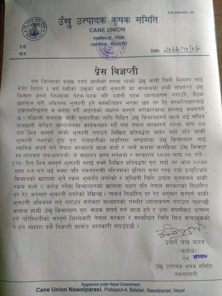 सहबान अन्सारी/नवलपरासी, ७ माघ नवलपरासीमा उखु किसानहरुको बाकी भुक्तानीको लागि सम्बद्ध सरोकारवालाहरुसंग जोडदार माग गरिएको छ । जिल्लामा प्रमुख नगदे बालीको रुपमा रहेको उखु बालीलाई प्रवर्द्वन गरि राज्यलाई चिनीमा आत्म निर्भर बनाउने उद्देश्य हुदाहुदै नेपालको चिनी उत्पादनमा उल्लेखनीय योगदान पुर्याउने उखु किसानहरुको पीडा सहन नसक्ने अवस्था रहेको छ । वर्ष भरी लगानी गरेर उत्पादन गरेको उखुको रकम भुक्तानीको लागी ३ बर्षसम्म पर्खिदापनि सन्बन्धित सरोकारवालाहरुको ध्यान नजानु आफैमा दुखद पक्ष रहेको उखु उत्पादक कृषक समिति नवलपरासीले विज्ञप्तिमार्फत जनाएको छ । पछिल्लो समयमा बाकी भुक्तानीका लागी पिडित किसानहरुले बाध्य भई संघिय राजधानी केन्द्रित अन्दोलनका कार्यक्रमहरु गर्दै गर्दा नेपाल सरकारले २०७६ माघ ७ गते भित्र सम्पुर्ण बाकी भुक्तानी गराउने लिखित प्रतिबद्धता जाहेर गर्दा पनि बाकी भुक्तानी नभएको हुदाँ पुन: राजधानीको माईतीघर मण्डलामा उखु किसानहरुलाई न्यायिक संघर्ष गर्न नेपाल सरकारले बाध्य पार्यो र त्यसै क्रममा सर्लाहीका उँखु किसान स्व. नारायण सयाभगतजी ले सहादत प्राप्त गर्नु भयो र सरकारले २०७७ माघ ५ गते ( २१) दिन भित्र सम्पुर्ण भुक्तानी गराई सक्ने लिखित प्रतिबद्धता पुन: गर्यो तर आज सम्म ईन्दिरा सुगर एण्ड एग्रो ईन्ड्रटिजले किसानको खातामा कुनै रकम भुक्तानी नगरेको र लुम्बिनी चिनी उधोगले बाकी रकम मध्ये २ करोड रुपैया किसानहरुको खातामा पठाएपनि नेपाल सरकारले निर्धारित दर रेट अनुसार भुक्तानी नगरेको देखिन्छ । निर्धारित दर रेटमा भुक्तानी प्रक्रिया अगाडि बढाई पीडित किसानहरुको भुक्तानी सुनिश्चित गर्न सरोकारवालाहरुसंग जोडदार माग गरिएको उत्पादक समितिका अध्यक्ष उमेश चन्द्र यादवद्वारा हस्ताक्षरित विज्ञप्तिमा उल्लेख गरिएको छ । साथै समयमा भुक्तानी नभए बाध्य भई संघर्षका कार्यक्रमहरु संचालन गर्नुपर्ने र सोबाट उत्पन्नहुने परिस्थितिको सम्पुर्ण जिम्मेवार नेपाल सरकार र सम्बन्धित मिल संचालकले नै लिनु पर्ने यादवले बताए । राष्ट्रिय दैनिक राष्ट्रिय दैनिक एक लोकप्रिय नेपाली समाचार पोर्टल हो। हामी सत्य तथ्य निश्पक्ष र सन्तुलित समाचार सम्प्रेषण गर्ने तर्फ उद्दत छौँ । हाम्रा टोल,समाज, शहर वा आम जनताका चुलो चौको देखि सदन सम्म अथवा समाजका उदाहरणीय ब्यक्ति, रास्ट्रका पहरेदार हरेक बिषय हाम्रा समाचारका श्रोत हुन् । आवाज बिहिनहरुको आवाजमा साथ अनि सरकारको बेथितिमा हाम्रो निगरानी हुनेछ । हामी राजनितीको रंग भर्दैनौं तर राजनितीको चेतना अवश्य भर्ने छौं ।