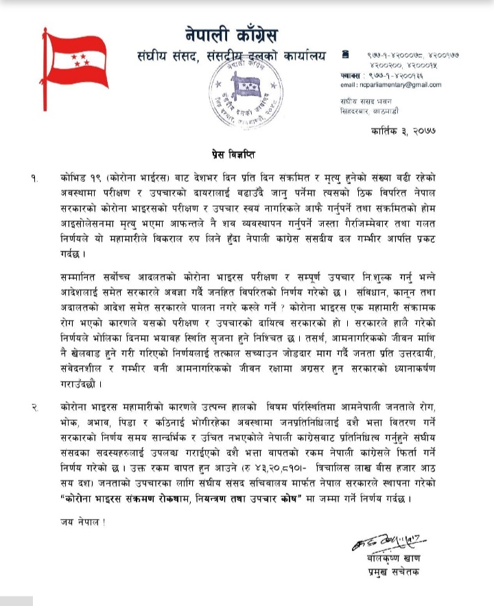 राष्ट्रिय दैनिक /काठमाडौं,३ कात्तिक प्रमुख प्रतिपक्षी नेपाली कांग्रेसका सांसदले आफ्ना सांसदको खातामा आएको दसैं भत्ता फिर्ता दिने निर्णय गरेको छ। कांग्रेस संसदीय दलका प्रमुख सचेतक बालकृष्ण खाँणका अनुसार पार्टीका सांसदको भत्तावापतको कूल रकम ४३ लाख २० हजार आठ सय १० रूपैयाँ फिर्ता दिने निर्णय भएको हो। ‘कांग्रेसबाट प्रतिनिधित्व गर्ने संघीय संसदका सदस्यलाई उपलब्ध गराइएको दसैं भत्तावापतको रकम कांग्रेसले फिर्ता गर्ने निर्णय गरेको छ,’ खाँणले भने, ‘४३ लाख २० हजार आठ सय १० रूपैयाँ जनताको उपचारका लागि संघीय संसद सचिवालयमार्फत नेपाल सरकारले स्थापना गरेको कोरोना कोषमा जम्मा गर्ने निर्णय गरिन्छ।’ सरकारले महामारीका बेला सांसदलाई भत्ता दिने निर्णय उचित नभएको उनले बताए। राष्ट्रिय दैनिक राष्ट्रिय दैनिक एक लोकप्रिय नेपाली समाचार पोर्टल हो। हामी सत्य तथ्य निश्पक्ष र सन्तुलित समाचार सम्प्रेषण गर्ने तर्फ उद्दत छौँ । हाम्रा टोल,समाज, शहर वा आम जनताका चुलो चौको देखि सदन सम्म अथवा समाजका उदाहरणीय ब्यक्ति, रास्ट्रका पहरेदार हरेक बिषय हाम्रा समाचारका श्रोत हुन् । आवाज बिहिनहरुको आवाजमा साथ अनि सरकारको बेथितिमा हाम्रो निगरानी हुनेछ । हामी राजनितीको रंग भर्दैनौं तर राजनितीको चेतना अवश्य भर्ने छौं ।