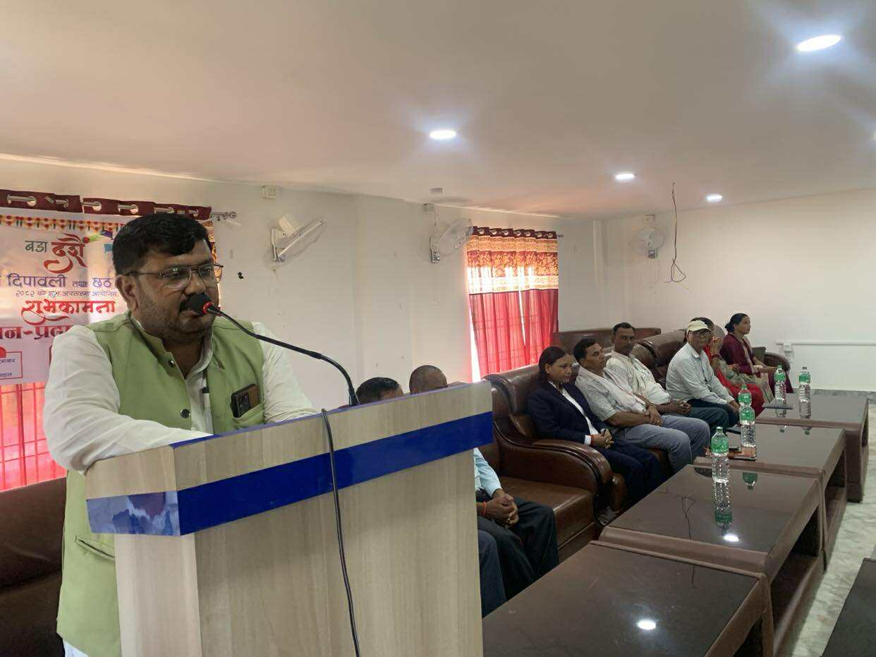 आरपि उपाध्याय / नवलपरासी ,१० असाेज प्रतापपुर गाउँपालिका पश्चिम नवलपरासीको आयोजनामा नेपालीहरुको महान पर्व विजयादशमी,शुभ दिपावली र छठ पर्वको शुभकामना आदानप्रदान कार्यक्रम शुक्रबार सम्पन्न भएको छ। प्रतापपुर गाउँपालिका अध्यक्ष उमेशचन्द्र यादवको अध्यक्षतामा कार्यक्रम सम्पन्न भएको हो। सो अवसरमा अध्यक्ष यादवले असत्यमाथी सत्यको जित,अन्यायमाथी न्यायको जित र राक्षसमाथी देवताको जितको रुपमा मनाइने विजयादशमी पर्वले सम्पुर्ण मानव जातिलाई सद मार्गमा हिड्ने प्रेरणा दिएको बताउनु भयो। उहाँले प्रतापपुर गाउँपालिकालाई सबैको साझा फुलबारी बनाउने अभियानमा लागिपरेको धारणा राख्दै अध्यक्ष यादवले सहमति,सहकार्य,एकता र मेलमिलापको माध्यमबाट अगाडि बढ्न सकिएमा नागरिकले चाहेको समाज बनाउन सकिने पनि जिकिर गर्नुभएको थियो। कार्यक्रममा प्रमुख प्रशासकीय अधिकृत अनिता बि.क. थारुले “हामी सबैको सार्थक प्रयास प्रतापपुर गाउँपालिकाको समग्र विकास” को नारालाई पूरा गर्न सम्पुर्ण पालिका बासी एक भएर अगाडि बढ्नुपर्ने धारणा राख्नुभयो। शुभकामना आदानप्रदान कार्यक्रममा प्रतापपुर गाउँपालिका वडा न.६ का वडा अध्यक्ष केशव प्रसाद अधिकारी,प्रशासकीय अधिकृत नन्दलाल कुमाल,त्रिभुवन मा.वि. बेलाटारीका प्रधानाध्यापक नारद ठाकुर लगायतले शुभकामना मन्तव्य व्यक्त गर्नुभएको थियो। कार्यक्रममा पालिका अन्तर्गतका जनप्रतिनिधि,कर्मचारी,शिक्षक,सामाजिक व्यक्तित्व र स्थानीय सञ्चारकर्मीहरुको पनि उपस्थिति रहेको कार्यक्रम सञ्चालक नारायण प्रसाद ढुंगानाले जानकारी दिनुभएको छ। राष्ट्रिय दैनिक राष्ट्रिय दैनिक एक लोकप्रिय नेपाली समाचार पोर्टल हो। हामी सत्य तथ्य निश्पक्ष र सन्तुलित समाचार सम्प्रेषण गर्ने तर्फ उद्दत छौँ । हाम्रा टोल,समाज, शहर वा आम जनताका चुलो चौको देखि सदन सम्म अथवा समाजका उदाहरणीय ब्यक्ति, रास्ट्रका पहरेदार हरेक बिषय हाम्रा समाचारका श्रोत हुन् । आवाज बिहिनहरुको आवाजमा साथ अनि सरकारको बेथितिमा हाम्रो निगरानी हुनेछ । हामी राजनितीको रंग भर्दैनौं तर राजनितीको चेतना अवश्य भर्ने छौं ।