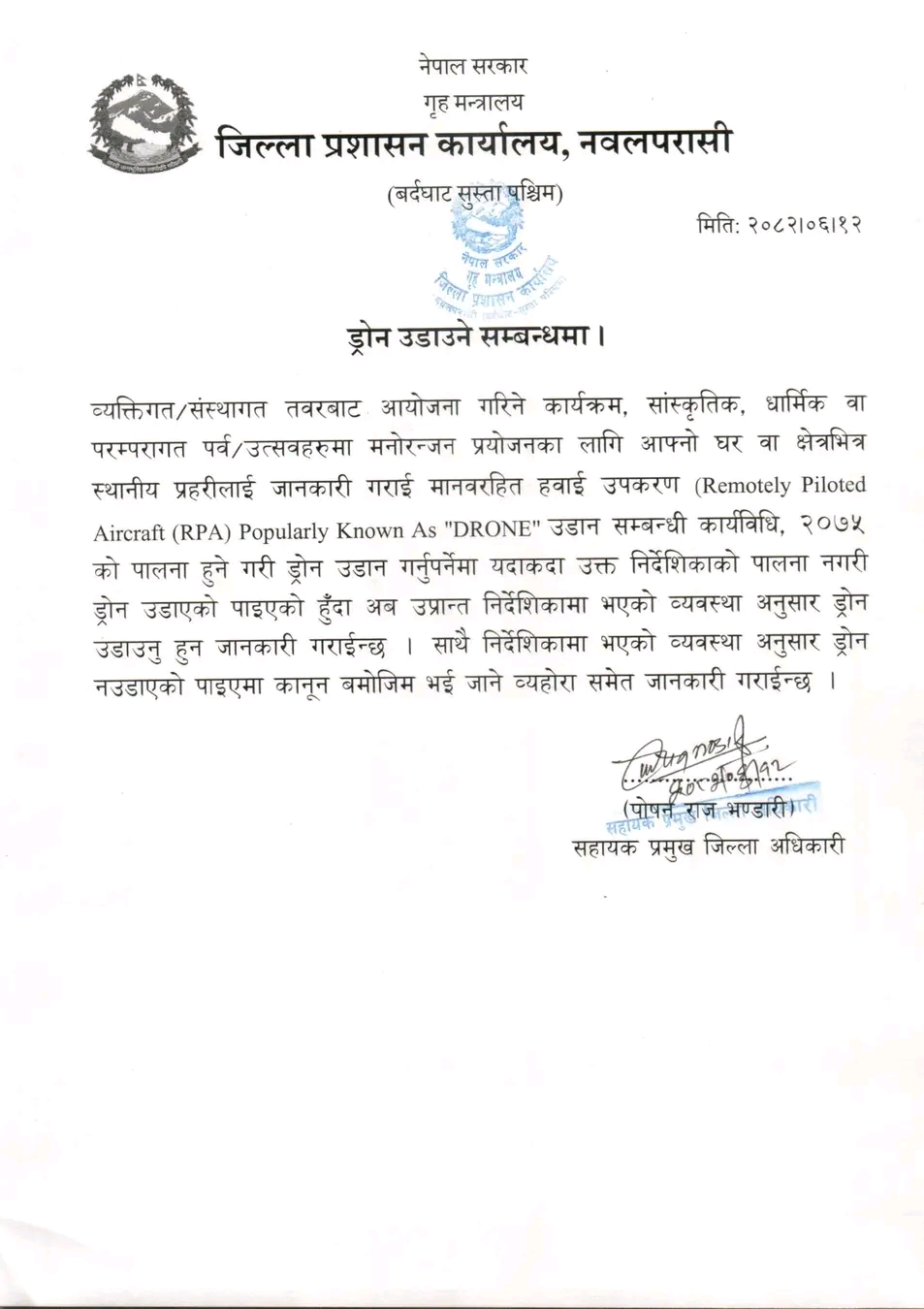 जिल्ला प्रशासन कार्यालय नवलपरासीको चेतावनी : प्रहरीलाई जानकारी बिना ड्रोन उडाए कारबाही हुने