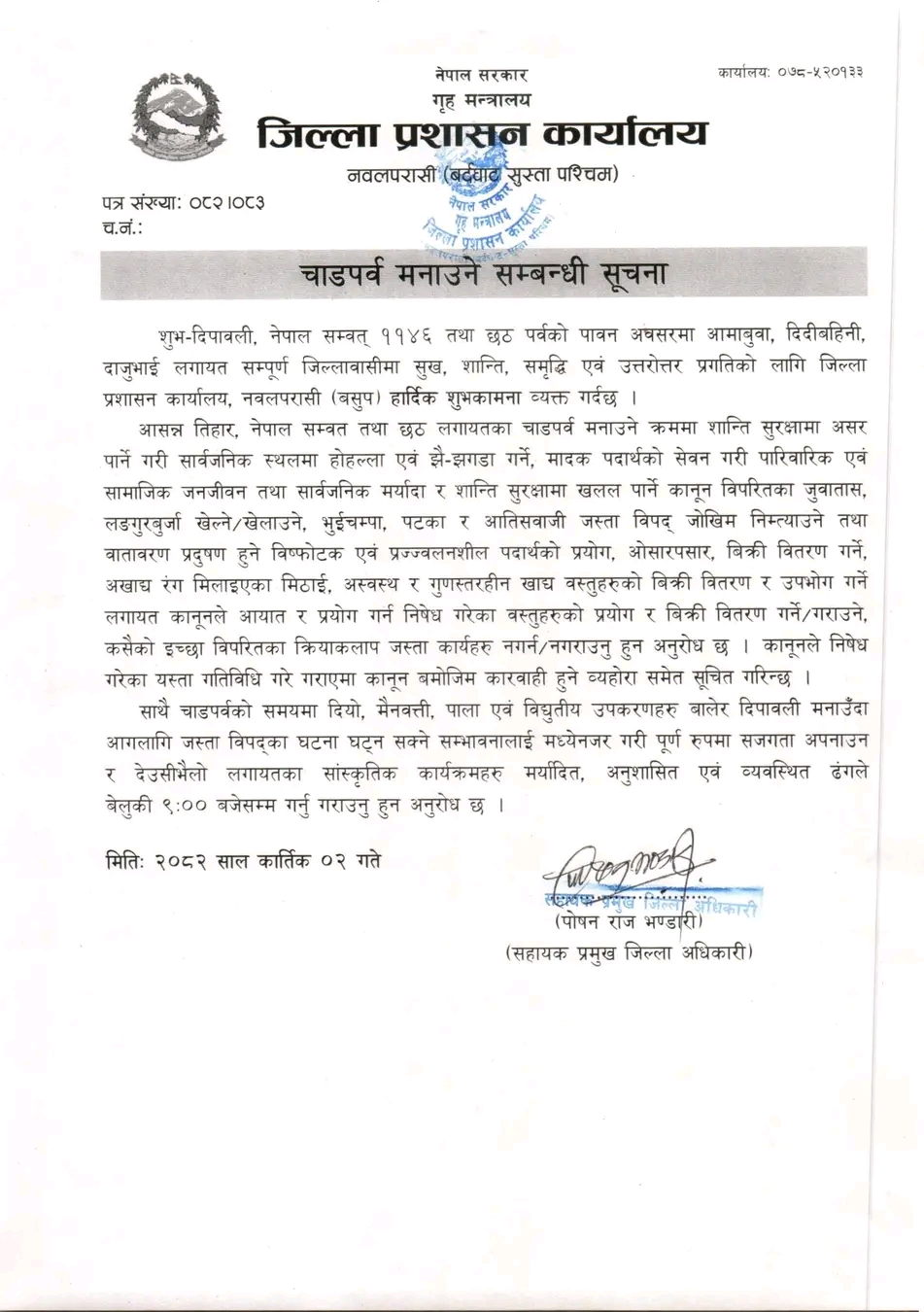 राष्ट्रिय दैनिक /नवलपरासी,२ कार्तिक दिपावली, नेपाल सम्बत् ११४६ र छठ पर्वको अवसरमा जिल्ला प्रशासन कार्यालय नवलपरासी (ब.सु.प.) ले सम्पूर्ण जिल्लावासीमा हार्दिक शुभकामना व्यक्त गर्दै चाडपर्वलाई शान्त, सभ्य र मर्यादित ढङ्गले मनाउन आग्रह गरेको छ। सहायक प्रमुख जिल्ला अधिकारी पोषण राज भण्डारीद्वारा जारी सूचनामा जनाइएको छ कि चाडपर्व मनाउने क्रममा शान्ति सुरक्षा, सार्वजनिक मर्यादा र सामाजिक सौहार्दमा खलल पर्ने कुनै पनि कार्य गर्न नहुनेछ। प्रशासनले विशेष गरी मादक पदार्थ सेवन, होहल्ला, झगडा, जुवा–तास, लङगुरबुर्जा, भुईचम्पा, पटका र आतिसबाजी जस्ता विस्फोटक पदार्थको प्रयोग, बिक्री वितरण तथा ओसारपसार नगर्न अनुरोध गरेको छ। यस्ता गतिविधि गर्नेलाई कानून बमोजिम कडा कारबाही गरिने चेतावनी पनि दिइएको छ। त्यस्तै प्रशासनले अखाद्य रंग मिसाइएका मिठाई, अस्वस्थ र गुणस्तरहीन खाद्य वस्तुहरूको बिक्री वितरण तथा उपभोग नगर्न आग्रह गरेको छ। सूचनामा भनिएको छ — “चाडपर्वको उल्लासमा स्वास्थ्य, सुरक्षामा जोखिम ल्याउने कार्य नगर्नुहोस्, हर्षोल्लासलाई मर्यादित र अनुशासित ढङ्गले मनाऔं।” दिपावलीको बेला दियो, मैनबत्ती वा विद्युतीय उपकरण प्रयोग गर्दा सम्भावित आगलागीबाट जोगिन सावधानी अपनाउन सबैलाई ध्यानाकर्षण गरिएको छ। त्यस्तै देउसी–भैलो लगायतका सांस्कृतिक कार्यक्रमहरू बेलुकी ९:०० बजेसम्म मात्र सञ्चालन गर्न अनुरोध गरिएको छ। जिल्ला प्रशासनले अन्त्यमा सबै नागरिकलाई शुभकामना दिंदै भनेको छ — “सबै नागरिकबीच आपसी सद्भाव, एकता र शान्तिको वातावरणमा चाडपर्व मनाऔं — यही सन्देश प्रशासनको हो।” राष्ट्रिय दैनिक राष्ट्रिय दैनिक एक लोकप्रिय नेपाली समाचार पोर्टल हो। हामी सत्य तथ्य निश्पक्ष र सन्तुलित समाचार सम्प्रेषण गर्ने तर्फ उद्दत छौँ । हाम्रा टोल,समाज, शहर वा आम जनताका चुलो चौको देखि सदन सम्म अथवा समाजका उदाहरणीय ब्यक्ति, रास्ट्रका पहरेदार हरेक बिषय हाम्रा समाचारका श्रोत हुन् । आवाज बिहिनहरुको आवाजमा साथ अनि सरकारको बेथितिमा हाम्रो निगरानी हुनेछ । हामी राजनितीको रंग भर्दैनौं तर राजनितीको चेतना अवश्य भर्ने छौं ।