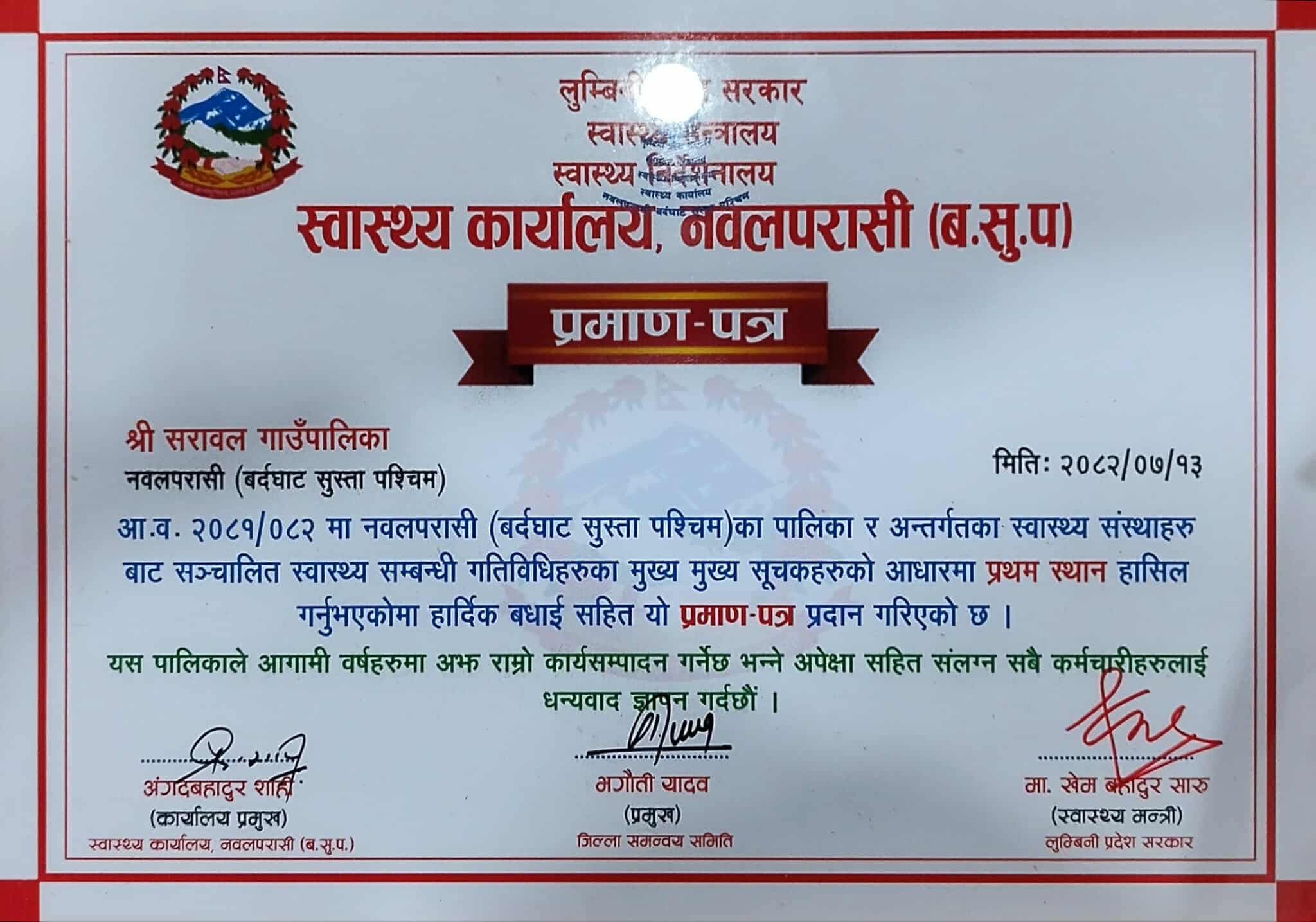 राष्ट्रिय दैनिक /नवलपरासी ,१३ कार्तिक । स्वास्थ्य कार्यालय नवलपरासी (ब.सु.प.) ले प्रकाशित गरेको वार्षिक मूल्यांकन अनुसार सरावल गाउँपालिकाले आर्थिक वर्ष २०८१/०८२ मा जिल्लाभरका पालिकामध्ये स्वास्थ्य सेवा सूचकमा पहिलो स्थान हासिल गरेको छ। स्वास्थ्य कार्यक्रमको प्रभावकारी कार्यान्वयन, मातृशिशु स्वास्थ्य सुधार, खोप अभियानको सफल सञ्चालन, पोषण तथा सरसफाइमा जनचेतना वृद्धि लगायतका सूचकका आधारमा सरावल गाउँपालिका अग्रस्थानमा आएको स्वास्थ्य कार्यालयले जनाएको छ। स्वास्थ्य कार्यालय नवलपरासीद्वारा भुमहीमा बुधबारदेखि आ.ब.२०८१/०८२ मा सम्पादित स्वास्थ्य कार्यक्रमहरुकाे जिल्लास्तरीय वार्षिक समिक्षा तथा याेजना तर्जुमा गाेष्ठी कार्यक्रममा स्वास्थ्य सेवा सूचकमा पहिलो स्थान लागि स्वास्थ्य कार्यालयले सरावल गाउँपालिकालाई प्रमाण–पत्र प्रदान गरेको छ। समारोहमा जिल्ला समन्वय समितिका प्रमुख भगौती यादव र स्वास्थ्य कार्यालय प्रमुख अंगदबहादुर शाही उपस्थित थिए। जिल्ला समन्वय समितिका प्रमुख यादवले पालिकाको सफलतालाई “स्थानीय नेतृत्व, स्वास्थ्यकर्मीको प्रतिबद्धता र समुदायको सहकार्यको उत्कृष्ट उदाहरण” भन्दै सराहना गरेका छन्। स्वास्थ्य कार्यालय प्रमुख शाहीका अनुसार सरावल गाउँपालिकाले विगत वर्षदेखि समुदायमुखी योजना, नियमित स्वास्थ्य निगरानी र सूचकअनुसारको अनुगमन प्रणालीलाई प्राथमिकतामा राख्दै आएको छ। यस उपलब्धिप्रति गाउँपालिका अध्यक्ष सुखाडी प्रसाद चौधरीले हार्दिक बधाई व्यक्त गर्दै भने “यो उपलब्धि निरन्तर मेहनत गर्दै जनताको सेवामा समर्पित सबै स्वास्थ्यकर्मी, कर्मचारी र जनप्रतिनिधिको सामूहिक प्रतिबद्धताको नतिजा हो।” उनले आगामी दिनमा पनि सरावल गाउँपालिकाले स्वास्थ्य क्षेत्रमा नयाँ उदाहरण स्थापित गर्दै जनसेवामा अझ सक्रिय भूमिका निर्वाह गर्ने विश्वास व्यक्त गरे। राष्ट्रिय दैनिक राष्ट्रिय दैनिक एक लोकप्रिय नेपाली समाचार पोर्टल हो। हामी सत्य तथ्य निश्पक्ष र सन्तुलित समाचार सम्प्रेषण गर्ने तर्फ उद्दत छौँ । हाम्रा टोल,समाज, शहर वा आम जनताका चुलो चौको देखि सदन सम्म अथवा समाजका उदाहरणीय ब्यक्ति, रास्ट्रका पहरेदार हरेक बिषय हाम्रा समाचारका श्रोत हुन् । आवाज बिहिनहरुको आवाजमा साथ अनि सरकारको बेथितिमा हाम्रो निगरानी हुनेछ । हामी राजनितीको रंग भर्दैनौं तर राजनितीको चेतना अवश्य भर्ने छौं ।