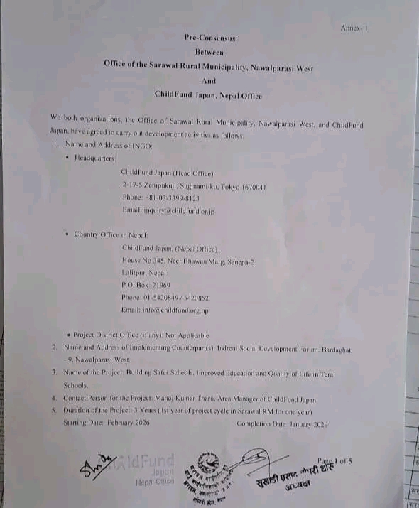 राष्ट्रिय दैनिक /नवलपरासी ,१४ कार्तिक शिक्षाको गुणस्तर सुधार र दिगो शैक्षिक विकासको लक्ष्यका साथ सरावल गाउँपालिका र Child Fund Japan बीच रु. ४ करोड ५९ लाख ५४ हजार ९२७ बराबरको शैक्षिक सहयोग कार्यक्रमका लागि ऐतिहासिक सम्झौता सम्पन्न भएको छ। सरावल गाउँपालिका अध्यक्ष सुखाडी प्रसाद चाैधरीकाे निजी सचिवालय फेसबुक पेजबाट सरावलका सम्पूर्ण वासिन्दा, अभिभावक, विद्यार्थी तथा शिक्षाप्रेमी महानुभावहरूलाई उपलब्धिकाे अवसरमा हार्दिक बधाई तथा शुभकामना व्यक्त गरिएको छ। यस सम्झौताअन्तर्गत सरावल गाउँपालिकाभित्रका शैक्षिक दृष्टिले पछाडि रहेका तर सम्भावनायुक्त विद्यालयहरूमा कार्यक्रम सञ्चालन गरिनेछ। ती विद्यालयहरूमा श्री जनता आधारभूत विद्यालय सरावल–५ धनगडवा ,विनोद–निता कण्डेल आधारभूत विद्यालय सरावल–५ दुबैलिया ,जनता माध्यमिक विद्यालय सरावल–६ भुजहवा ,महेन्द्र जनता माध्यमिक विद्यालय सरावल–६ गडौरी समावेश छन्। कार्यक्रममार्फत विद्यालयहरूको भौतिक पूर्वाधार सुधार, शिक्षण–अधिगमको गुणस्तर अभिवृद्धि, विद्यार्थी सीप विकास र अभिभावक तथा समुदायबीच शिक्षा प्रतिको जागरुकता विस्तार गरिनेछ। यो सहकार्यले सरावल गाउँपालिकालाई “गुणस्तरीय र सबैका लागि शिक्षा” को लक्ष्यमा अझ नजिक पुर्याउने अपेक्षा गरिएको छ। साथै यस कार्यक्रमको कार्यान्वयनका लागि स्थानीय साझेदार संस्थाका रूपमा ईन्द्रेणी सामाजिक विकास मञ्चसँग समेत सहकार्य गरिएको छ। राष्ट्रिय दैनिक राष्ट्रिय दैनिक एक लोकप्रिय नेपाली समाचार पोर्टल हो। हामी सत्य तथ्य निश्पक्ष र सन्तुलित समाचार सम्प्रेषण गर्ने तर्फ उद्दत छौँ । हाम्रा टोल,समाज, शहर वा आम जनताका चुलो चौको देखि सदन सम्म अथवा समाजका उदाहरणीय ब्यक्ति, रास्ट्रका पहरेदार हरेक बिषय हाम्रा समाचारका श्रोत हुन् । आवाज बिहिनहरुको आवाजमा साथ अनि सरकारको बेथितिमा हाम्रो निगरानी हुनेछ । हामी राजनितीको रंग भर्दैनौं तर राजनितीको चेतना अवश्य भर्ने छौं ।