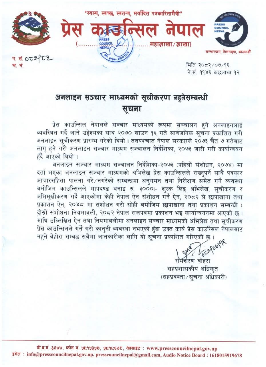 राष्ट्रिय दैनिक /काठमाडौँ,१६ कात्तिक प्रेस काउन्सिल नेपालले अबदेखि अनलाइन सञ्चार माध्यमहरूको सूचीकरण (registration) नगर्ने भएको छ। काउन्सिलले शुक्रबार एक सूचना जारी गर्दै हालै कार्यान्वयनमा आएको कानुनी संशोधनअनुसार यो जिम्मेवारी अब आफ्नो अधिकारक्षेत्रभित्र नपर्ने स्पष्ट गरेको हो। काउन्सिलका अनुसार अनलाइन सञ्चार माध्यमलाई व्यवस्थित बनाउनका लागि २०७० सालदेखि सूचीकरणको प्रक्रिया सुरु गरिएको थियो। त्यसपछि नेपाल सरकारले २०७३ चैत ७ गतेबाट लागु हुने गरी ‘अनलाइन सञ्चार माध्यम सञ्चालन निर्देशिका–२०७३’ जारी गरेको थियो। सो निर्देशिकाअनुसार प्रेस काउन्सिलले अभिलेख राख्ने, सूचीकरण गर्ने र पत्रकार आचारसंहिता पालनाको अनुगमन गर्ने काम गर्दै आएको थियो। तर हालै लागू भएको “नेपाल ऐन संशोधन गर्ने ऐन, २०८२” र त्यसअन्तर्गतको “छापाखाना तथा प्रकाशन (दोस्रो संशोधन) नियमावली, २०८२” अनुसार अनलाइन सञ्चार माध्यमको अभिलेख तथा सूचीकरण गर्ने कानुनी अधिकार प्रेस काउन्सिललाई नरहेको उल्लेख गरिएको छ। त्यसैले अबदेखि अनलाइन सञ्चार माध्यमको सूचीकरण सम्बन्धी कार्य प्रेस काउन्सिलबाट नहुने स्पष्ट गरिएको छ। काउन्सिलका सहप्रवक्ता तथा सूचना अधिकारी रामशरण बोहरा (सहप्रशासकीय अधिकृत) ले जारी गरेको सूचनामा सबै सरोकारवालालाई यसबारे जानकारी गराइएको छ। प्रेस काउन्सिलले पछिल्ला वर्षहरूमा अनलाइन सञ्चारमाध्यमहरूको सूचीकरण, अभिमुखीकरण तथा पत्रकार आचारसंहिता अनुगमनमा सक्रिय भूमिका निर्वाह गर्दै आएको थियो। नयाँ कानुनी व्यवस्थापछि अब अनलाइन सञ्चार माध्यमको नियमन तथा सूचीकरण कसले गर्ने भन्ने विषयमा आगामी दिनमा सरकारले स्पष्ट नीति ल्याउने अपेक्षा गरिएको छ। राष्ट्रिय दैनिक राष्ट्रिय दैनिक एक लोकप्रिय नेपाली समाचार पोर्टल हो। हामी सत्य तथ्य निश्पक्ष र सन्तुलित समाचार सम्प्रेषण गर्ने तर्फ उद्दत छौँ । हाम्रा टोल,समाज, शहर वा आम जनताका चुलो चौको देखि सदन सम्म अथवा समाजका उदाहरणीय ब्यक्ति, रास्ट्रका पहरेदार हरेक बिषय हाम्रा समाचारका श्रोत हुन् । आवाज बिहिनहरुको आवाजमा साथ अनि सरकारको बेथितिमा हाम्रो निगरानी हुनेछ । हामी राजनितीको रंग भर्दैनौं तर राजनितीको चेतना अवश्य भर्ने छौं ।