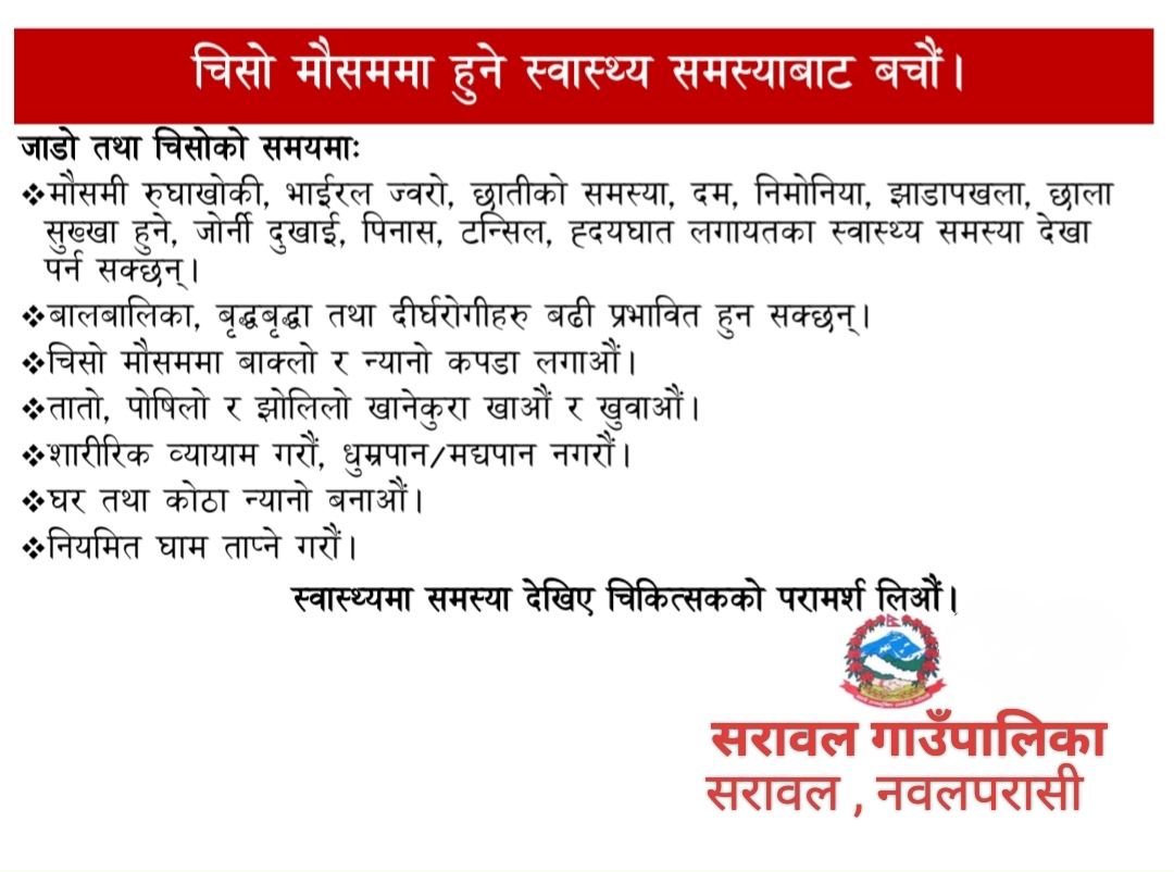 राष्ट्रिय दैनिक /नवलपरासी, ७ मंसिर पश्चिम नवलपरासीको सरावल गाउँपालिका वडा नम्बर ३ मा आयोजित २ दिने बाल–बालिका क्षमता विकास तालिम सफलतापूर्वक सम्पन्न भएको छ। सरावल गाउँपालिकाको आयोजनामा सञ्चालन गरिएको उक्त तालिममा विभिन्न बालक्लबका पदाधिकारी तथा बालबालिकाको सक्रिय सहभागिता रहेको थियो। तालिममा बालमैत्री राष्ट्रिय सहजकर्ता शर्मिला पौडेल र उमेश बि.क प्रशिक्षकका रुपमा उपस्थित रहेर बालअधिकार, नेतृत्व कौशल, समूहगत काम गर्ने सीप, व्यक्तित्व विकास तथा बाल संरक्षणसम्बन्धी व्यावहारिक सीप प्रदान गरिएको थियो। कार्यक्रमको अध्यक्षता सरावल–३ स्तरीय बाल सञ्जालकी अध्यक्ष सारदा पाण्डेयले गर्नुभएको थियो। उक्त कार्यक्रममा सरावल गाउँपालिकाका अध्यक्ष सुखाडी प्रसाद चौधरी प्रमुख अतिथिको रुपमा उपस्थित रहनुभएको थियो । कार्यक्रमलाई सम्बोधन गर्दै अध्यक्ष चौधरीले बालबालिकाको प्रतिभा, क्षमता र अधिकार संरक्षणका कार्यक्रमलाई गाउँपालिकाले निरन्तर प्राथमिकतामा राखेको बताउनुभयो। उहाँले बालमैत्री स्थानीय शासन निर्माणमा बालक्लबहरूको भूमिकालाई महत्वपूर्ण बताउँदै यस्ता तालिमले भविष्यका नेतृत्व बन्ने आधार निर्माण गर्ने उल्लेख गर्नुभयो। त्यस्तै गाउँपालिकाकी उपाध्यक्ष बासमती हरिजनले बालबालिकामाथि हुने जोखिम, हिंसा तथा भेदभाव अन्त्य गर्न स्थानीय तह सदैव सक्रिय रहेको बताउँदै बाल सहभागिता अझ प्रभावकारी बनाउन आग्रह गर्नुभयो। कार्यक्रममा सरावल प्रेस क्लबका अध्यक्ष उमेश बि.कले बालबालिकाको प्रतिभा उजागर गर्न पत्रकारिताको पक्षबाट पनि निरन्तर साथ रहने कुरा बताउनुभयो। तालिममा सरावल–३ अन्तर्गतका विभिन्न बालक्लबका पदाधिकारीहरू सहभागी रहेका थिए। कार्यक्रमको सञ्चालन तथा सहजीकरणमा सरावल–३ का बाल सहजकर्ता सञ्जय मौर्य सक्रिय रहेका थिए। तालिमको समापन अवसरमा उपस्थित बालक्लबहरूलाई स्टेशनरी सामग्री वितरण गरिएको थियो। राष्ट्रिय दैनिक राष्ट्रिय दैनिक एक लोकप्रिय नेपाली समाचार पोर्टल हो। हामी सत्य तथ्य निश्पक्ष र सन्तुलित समाचार सम्प्रेषण गर्ने तर्फ उद्दत छौँ । हाम्रा टोल,समाज, शहर वा आम जनताका चुलो चौको देखि सदन सम्म अथवा समाजका उदाहरणीय ब्यक्ति, रास्ट्रका पहरेदार हरेक बिषय हाम्रा समाचारका श्रोत हुन् । आवाज बिहिनहरुको आवाजमा साथ अनि सरकारको बेथितिमा हाम्रो निगरानी हुनेछ । हामी राजनितीको रंग भर्दैनौं तर राजनितीको चेतना अवश्य भर्ने छौं ।