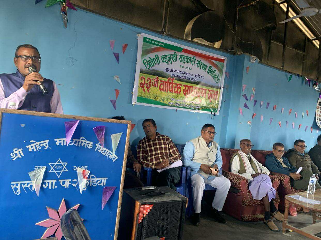 आरपि उपाध्याय / त्रिवेणी ,२१ मंसिर त्रिवेणी बहुमुखी सहकारी संस्था सुस्ता २ कुडिया पश्चिम नवलपरासीको २३ औं वार्षिक साधारणसभा महेन्द्र मा.वि. कुडियाको प्राङ्गणमा सम्पन्न भएको छ। संस्थाका अध्यक्ष प्रेमचन्द्र गुप्ताको अध्यक्षतामा साधारणसभा सम्पन्न भएको हो। सो अवसरमा अध्यक्ष गुप्ताले सहकारी संस्थामा सेयर सदस्यहरुलाई अत्यधिक सेवा पुर्याउनु नै संस्थाको मुख्य उद्देश्य रहेको बताउदै संस्था नाफा नोक्सानभन्दा पनि सेवामूलक हुनुपर्ने अध्यक्ष गुप्ताको भनाइ रहेको थियो। कार्यक्रममा संस्थाका व्यवस्थापक यज्ञ प्रसाद उपाध्यायले आर्थिक प्रतिवेदन, लेखा संयोजक रामअवध गुप्ताले लेखा प्रतिवेदन प्रस्तुत गर्नुभएको थियो। साधारणसभामा संस्थाका उपाध्यक्ष रियाजुल अन्सारी,महेन्द्र मा.वि. कुडियाका पुर्व प्र.अ. भुपनारायण चौधरी,पुर्व अध्यक्ष राम बहादुर जर्घा, समाजसेवी नारायण प्रसाद पाण्डे लगायतले संस्थाको गतिविधि माथि प्रकाश पार्नुभएको आयोजक संस्थाले बताएको छ। साधारणसभाले संस्थामा विगत र वर्तमान समयमा भएको गतिविधि माथि छलफल भएको जानकारीमा आएको छ। संस्थामा हाल पुरुष ३८७ र महिला २०१ गरि कुल ५८८ सेयर सदस्य रहेको संस्थाका कर्मचारी टीका ज्ञवालीले बताएका छन। नवलपरासीको पुरानो सहकारी संस्था मध्ये त्रिवेणी बहुमुखी सहकारी संस्था एक रहेकोमा संस्थाले आफ्नो स्थापना कालदेखि नै हालसम्म कृषि सामाग्री लगायतका वस्तुहरु बिक्रीवितरण सहित सहकारी शिक्षालाई लागू गर्दै आएको पनि जानकारी प्राप्त भएको छ। राष्ट्रिय दैनिक राष्ट्रिय दैनिक एक लोकप्रिय नेपाली समाचार पोर्टल हो। हामी सत्य तथ्य निश्पक्ष र सन्तुलित समाचार सम्प्रेषण गर्ने तर्फ उद्दत छौँ । हाम्रा टोल,समाज, शहर वा आम जनताका चुलो चौको देखि सदन सम्म अथवा समाजका उदाहरणीय ब्यक्ति, रास्ट्रका पहरेदार हरेक बिषय हाम्रा समाचारका श्रोत हुन् । आवाज बिहिनहरुको आवाजमा साथ अनि सरकारको बेथितिमा हाम्रो निगरानी हुनेछ । हामी राजनितीको रंग भर्दैनौं तर राजनितीको चेतना अवश्य भर्ने छौं ।