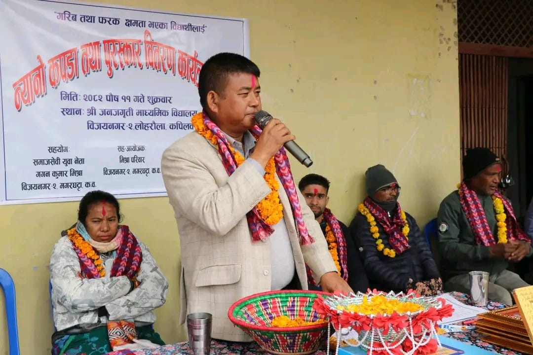 धर्मेन्द्र कुमार कुर्मी/ कपिलवस्तु, १२ पुस कपिलवस्तुको विजयनगर गाउँपालिका–२ लोहरौलामा अवस्थित जनजागृति माध्यमिक विद्यालयमा अध्ययनरत बाल विकास केन्द्रका ६० जना विद्यार्थीलाई न्यानो कपडा वितरण गरिएको छ। विजयनगर गाउँपालिका–२ मगरघट्टाका समाजसेवी गगन कुमार मिश्रले शुक्रबार बाल विकास केन्द्रमा अध्ययनरत विद्यार्थीहरूलाई जाडो मौसमलाई मध्यनजर गर्दै स्विटर र टाउजर वितरण गर्नुभएको हो। विद्यालयका प्रधानाध्यापक मिर्जा प्रसाद चौधरीले मिश्र परिवारको सहयोगले साना बालबालिकालाई जाडोबाट जोगाउन सहयोग पुगेको बताउनुभयो। उहाँले यस्ता सामाजिक कार्यले विद्यार्थीहरूमा सकारात्मक ऊर्जा थपिने विश्वास व्यक्त गर्नुभयो। यसै अवसरमा विद्यालयले अर्धवार्षिक परीक्षाको नतिजा प्रकाशन गर्नुका साथै उत्कृष्ट प्रदर्शन गर्ने विद्यार्थीहरूलाई पुरस्कार वितरण कार्यक्रम समेत सम्पन्न गरेको जनाएको छ। राष्ट्रिय दैनिक राष्ट्रिय दैनिक एक लोकप्रिय नेपाली समाचार पोर्टल हो। हामी सत्य तथ्य निश्पक्ष र सन्तुलित समाचार सम्प्रेषण गर्ने तर्फ उद्दत छौँ । हाम्रा टोल,समाज, शहर वा आम जनताका चुलो चौको देखि सदन सम्म अथवा समाजका उदाहरणीय ब्यक्ति, रास्ट्रका पहरेदार हरेक बिषय हाम्रा समाचारका श्रोत हुन् । आवाज बिहिनहरुको आवाजमा साथ अनि सरकारको बेथितिमा हाम्रो निगरानी हुनेछ । हामी राजनितीको रंग भर्दैनौं तर राजनितीको चेतना अवश्य भर्ने छौं ।