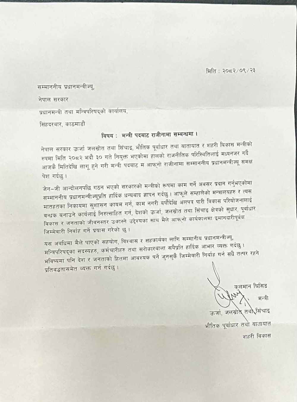 काठमाडौँ ,२३ पुस — ऊर्जा, जलस्रोत तथा सिँचाइमन्त्री कुलमान घिसिङले पदबाट राजीनामा दिएका छन्। भौतिक पूर्वाधार तथा सहरी विकास मन्त्रालयको समेत जिम्मेवारी सम्हाल्दै आएका मन्त्री घिसिङले बुधबार साँझ प्रधानमन्त्री सुशीला कार्कीलाई बालुवाटारमा पुगेर राजीनामा पत्र बुझाएका हुन्। बालुवाटारबाट फर्किएपछि मन्त्री घिसिङले ऊर्जा मन्त्रालयमा पत्रकार सम्मेलन गरी आफ्नो राजीनामाबारे आधिकारिक धारणा सार्वजनिक गर्ने तयारी गरेका छन्। चुनाव गराउने स्पष्ट म्यान्डेटसहित प्रधानमन्त्री सुशीला कार्कीको नेतृत्वमा गठन भएको नागरिक सरकारका केही मन्त्रीहरू दलीय राजनीतिमा सक्रिय भएको भन्दै पछिल्लो समय जनस्तरबाट निरन्तर प्रश्न उठ्दै आएको थियो। यही सन्दर्भमा प्रधानमन्त्री कार्कीले मन्त्रिपरिषद् बैठकमा नामै तोकेर ऊर्जा मन्त्री कुलमान घिसिङ, उद्योग मन्त्री जगदीश खरेल तथा आपूर्तिमन्त्री बब्लु गुप्तासँग राजीनामा मागेकी थिइन्। प्रधानमन्त्रीको निर्देशनपछि मन्त्री घिसिङले राजीनामा दिएसँगै नागरिक सरकारको निष्पक्षता र चुनावी तयारीप्रतिको प्रतिबद्धता पुनः बहसको केन्द्रमा आएको छ। राष्ट्रिय दैनिक राष्ट्रिय दैनिक एक लोकप्रिय नेपाली समाचार पोर्टल हो। हामी सत्य तथ्य निश्पक्ष र सन्तुलित समाचार सम्प्रेषण गर्ने तर्फ उद्दत छौँ । हाम्रा टोल,समाज, शहर वा आम जनताका चुलो चौको देखि सदन सम्म अथवा समाजका उदाहरणीय ब्यक्ति, रास्ट्रका पहरेदार हरेक बिषय हाम्रा समाचारका श्रोत हुन् । आवाज बिहिनहरुको आवाजमा साथ अनि सरकारको बेथितिमा हाम्रो निगरानी हुनेछ । हामी राजनितीको रंग भर्दैनौं तर राजनितीको चेतना अवश्य भर्ने छौं ।