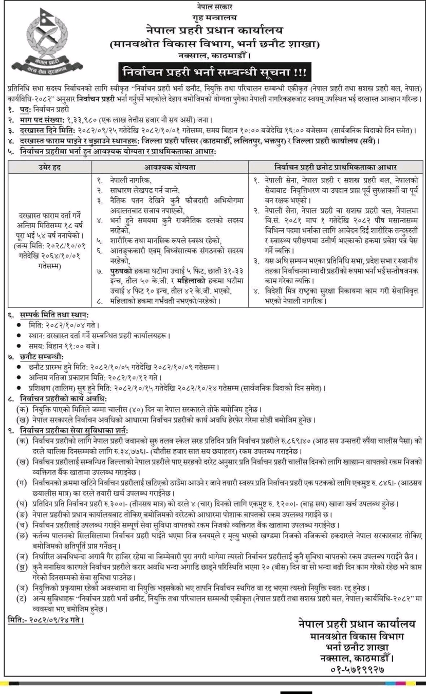 काठमाडौं ,२४ पुस। सरकारले प्रतिनिधिसभा सदस्य निर्वाचनका लागि निर्वाचन प्रहरी भर्नाका लागि आवेदन आह्वान गरेको छ । प्रहरी प्रधान कार्यालयले एक लाख ३३ हजार ९८० निर्वाचन प्रहरी भर्नाका लागि आवेदन माग गरेको छ । दरखास्त पुस २५ देखि माघ १ गतेसम्म दिन सकिनेछ । बिहान १० देखि अपराह्न ४ बजेसम्म सम्बन्धित जिल्ला प्रहरी कार्यालयमा दरखास्त दिन सकिनेछ । दरखास्त दिने व्यक्ति १८ वर्ष पूरा भई ५४ वर्ष ननाघेको हुनुपर्नेछ । सेवाअवधी कम्तीमा ४० दिन हुने बताइएको छ । सरकारले फागुन २१ गते प्रतिनिधिसभा सदस्य निर्वाचन गर्दै छ । सोही प्रयोजनका लागि निर्वाचन प्रहरी भर्ना गर्न लागेको हो । राष्ट्रिय दैनिक राष्ट्रिय दैनिक एक लोकप्रिय नेपाली समाचार पोर्टल हो। हामी सत्य तथ्य निश्पक्ष र सन्तुलित समाचार सम्प्रेषण गर्ने तर्फ उद्दत छौँ । हाम्रा टोल,समाज, शहर वा आम जनताका चुलो चौको देखि सदन सम्म अथवा समाजका उदाहरणीय ब्यक्ति, रास्ट्रका पहरेदार हरेक बिषय हाम्रा समाचारका श्रोत हुन् । आवाज बिहिनहरुको आवाजमा साथ अनि सरकारको बेथितिमा हाम्रो निगरानी हुनेछ । हामी राजनितीको रंग भर्दैनौं तर राजनितीको चेतना अवश्य भर्ने छौं ।