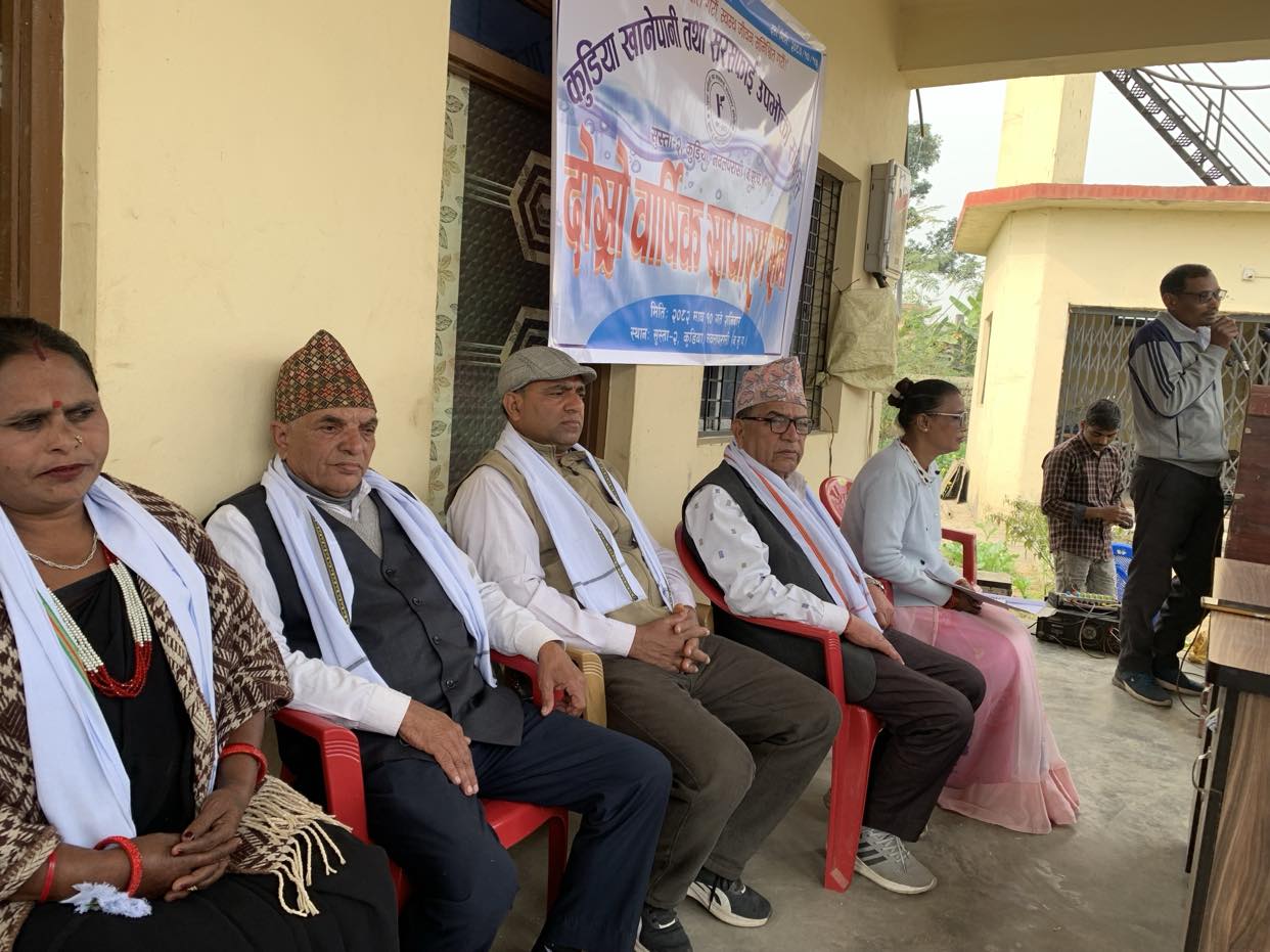 आरपि उपाध्याय / नवलपुर, माघ १० कुडिया खानेपानी तथा सरसफाइ उपभोक्ता समिति, सुस्ता गाउँपालिका–२ को दोस्रो वार्षिक साधारणसभा शनिबार सम्पन्न भएको छ। खानेपानी तथा सरसफाइ उपभोक्ता समितिकी अध्यक्ष कान्तिदेवी चौधरीको अध्यक्षता तथा सुस्ता गाउँपालिकाका अध्यक्ष टेकनारायण उपाध्यायको प्रमुख आतिथ्यतामा साधारणसभा सम्पन्न भएको हो। सो अवसरमा प्रमुख अतिथि उपाध्यायले मानव जीवनमा पानीको अत्यन्त ठूलो महत्व रहेको उल्लेख गर्दै पानीलाई सुरक्षित, स्वच्छ र सर्वसुलभ बनाउनेतर्फ सबै पक्षको ध्यान जानुपर्ने धारणा व्यक्त गर्नुभयो। उहाँले नागरिकलाई शुद्ध खानेपानी उपलब्ध गराउनु हामी सबैको साझा कर्तव्य भएको उल्लेख गर्दै शुद्ध खानेपानी व्यवस्थापनका लागि स्थानीय सरकार प्रतिबद्ध रहेको बताउनुभयो। साधारणसभामा बाग्मती चिनी कारखानाका प्रतिनिधि सुरेन्द्र प्रसाद गुप्ता, समाजसेवी भूपनारायण चौधरी, रामप्रसाद चौधरीलगायतले खानेपानीको महत्वबारे आ–आफ्नो धारणा राख्नुभएको थियो। कार्यक्रममा समितिकी अध्यक्ष कान्तिदेवी चौधरीले अध्यक्षीय प्रतिवेदनसहित संस्थाको आय–व्यय विवरण प्रस्तुत गर्नुभएको जानकारी दिइएको छ। हाल कुडिया खानेपानी तथा सरसफाइ उपभोक्ता समितिमा १७३ जना साधारण सदस्य रहेका छन् भने ११८ घरधुरीमा खानेपानीको धारा जडान गरिएको आयोजकले जानकारी गराएको छ। राष्ट्रिय दैनिक राष्ट्रिय दैनिक एक लोकप्रिय नेपाली समाचार पोर्टल हो। हामी सत्य तथ्य निश्पक्ष र सन्तुलित समाचार सम्प्रेषण गर्ने तर्फ उद्दत छौँ । हाम्रा टोल,समाज, शहर वा आम जनताका चुलो चौको देखि सदन सम्म अथवा समाजका उदाहरणीय ब्यक्ति, रास्ट्रका पहरेदार हरेक बिषय हाम्रा समाचारका श्रोत हुन् । आवाज बिहिनहरुको आवाजमा साथ अनि सरकारको बेथितिमा हाम्रो निगरानी हुनेछ । हामी राजनितीको रंग भर्दैनौं तर राजनितीको चेतना अवश्य भर्ने छौं ।