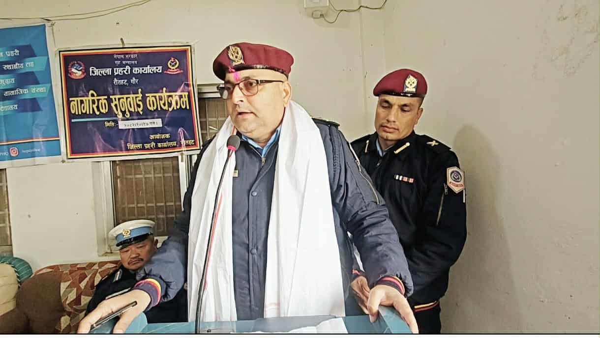 राजकुमार यादव / रौतहट ,१७ माघ रौतहट जिल्ला प्रहरी कार्यालयको आयोजना तथा मौलापुर नगरपालिकाको सहकार्यमा समुदाय-प्रहरी साझेदारी अवधारणा अन्तर्गत नागरिक सुनुवाइ कार्यक्रम शनिबार मौलापुर नगरपालिकाको सभा हलमा भव्य रूपमा सम्पन्न भएको छ। कार्यक्रमको सञ्चालन मौलापुर इलाका प्रहरी कार्यालयका प्रहरी निरीक्षक भरत केसीले गरेका थिए। संयमित नेतृत्व, स्पष्ट वाक्पटुता र विषयवस्तुमा गहिरो पकड देखाएका निरीक्षक केसीले सम्पूर्ण कार्यक्रमलाई अनुशासित, जीवन्त र उद्देश्यपूर्ण ढंगले अगाडि बढाएका थिए। सहभागीहरूलाई सहज रूपमा जोड्दै नागरिक र प्रहरीबीचको सम्बन्धलाई अझ मजबुत बनाउने उनको प्रस्तुति प्रशंसनीय रह्यो। कार्यक्रममा रौतहट जिल्ला प्रहरी प्रमुख प्रहरी उपरीक्षक सिताराम रिजाल, जिल्ला ट्राफिक प्रहरी कार्यालयका प्रहरी निरीक्षक राजेन्द्र थापा मगर, मौलापुर नगरपालिकाका सम्पूर्ण वडाध्यक्षहरू, सामुदायिक सेवा केन्द्रका पदाधिकारी, स्थानीय बुद्धिजीवी तथा सर्वसाधारणको उल्लेख्य उपस्थिति रहेको थियो। नागरिक सुनुवाइ कार्यक्रममा प्रहरी उपरीक्षक रिजालले चालु आर्थिक वर्षमा जिल्ला प्रहरी कार्यालयबाट सम्पादन गरिएका प्रमुख कामकारबाहीहरू श्रव्य–दृश्य माध्यममार्फत प्रस्तुत गर्दै समुदायको सहकार्यबिना शान्त, सुरक्षित र मर्यादित समाज निर्माण सम्भव नहुने स्पष्ट पारे। उनले विशेषगरी लागुऔषध नियन्त्रणलाई उच्च प्राथमिकता दिइएको उल्लेख गर्दै यसविरुद्ध सबै पक्षको सक्रिय सहयोग आवश्यक रहेको बताए। यस्तै, जिल्ला ट्राफिक प्रहरी कार्यालयका प्रहरी निरीक्षक राजेन्द्र थापा मगरले सडक दुर्घटना न्यूनीकरणका लागि ट्राफिक नियमको पूर्ण पालना अनिवार्य रहेकोमा जोड दिए। साना लापरबाहीले ठूला दुर्घटना निम्त्याउने भन्दै उनले हेलमेट र सिट बेल्टको प्रयोग, गति नियन्त्रण तथा मापदण्डअनुसार सवारी साधन सञ्चालन गर्न आग्रह गरे। कार्यक्रममा सहभागी स्थानीयवासीहरूले लागुऔषध कारोबार, समाजमा विद्यमान छुवाछुतको समस्या, तथा भारतबाट सादी विवाह प्रयोजनका लागि ल्याइने सामग्री प्रहरीले नियन्त्रणमा लिने विषय लगायतका प्रश्न र गुनासो राखेका थिए। प्रहरी नेतृत्वले उठाइएका गुनासोहरू लाई कानुनी दायराभित्र रही समाधान गरिने प्रतिबद्धता व्यक्त गरेको छ। नागरिक र प्रहरीबीच प्रत्यक्ष संवाद, विश्वास र सहकार्यको उदाहरण बनेको उक्त कार्यक्रमले मौलापुर क्षेत्रमा सुरक्षा, सामाजिक सद्भाव र सचेतनाको नयाँ सन्देश प्रवाह गरेको सहभागीहरूको भनाइ रहेको छ। राष्ट्रिय दैनिक राष्ट्रिय दैनिक एक लोकप्रिय नेपाली समाचार पोर्टल हो। हामी सत्य तथ्य निश्पक्ष र सन्तुलित समाचार सम्प्रेषण गर्ने तर्फ उद्दत छौँ 