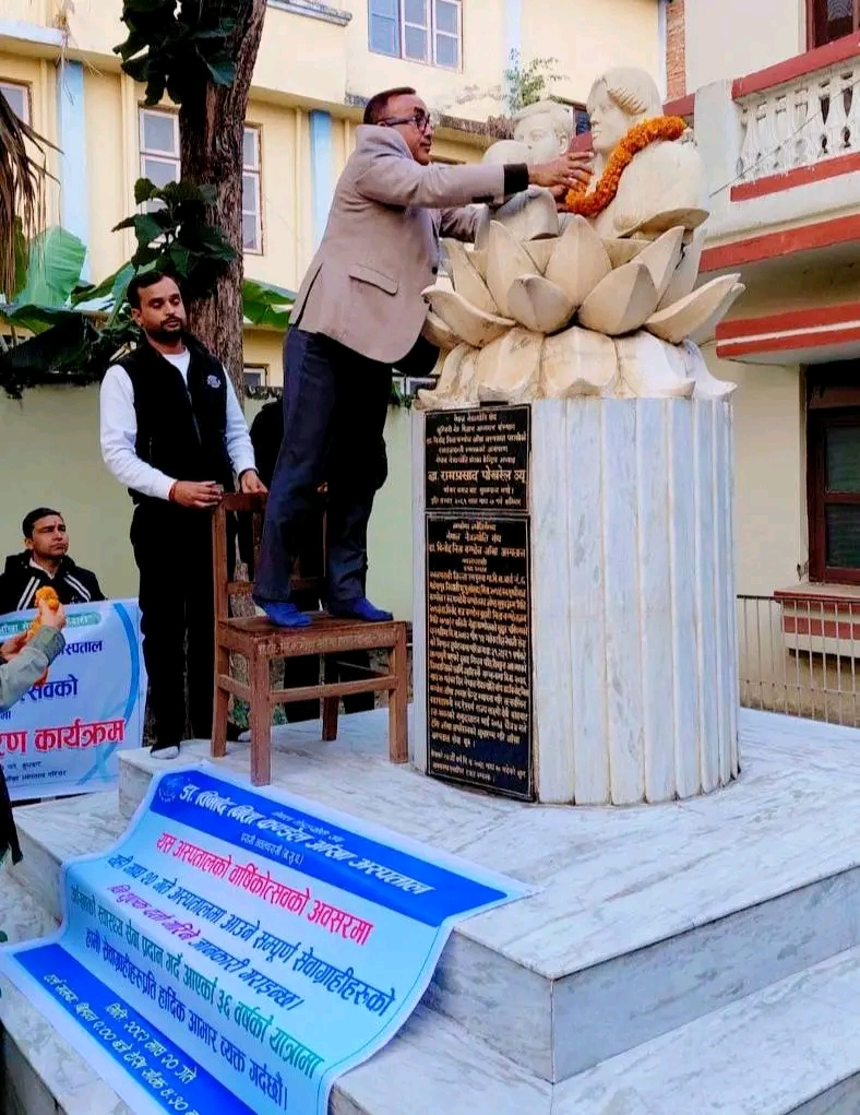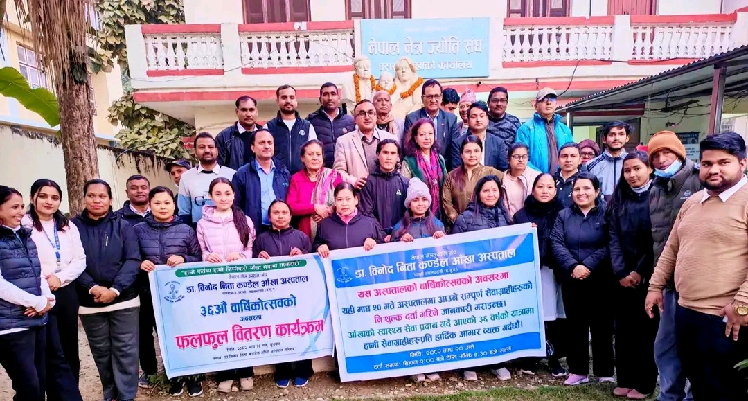 राष्ट्रिय दैनिक / नवलपरासी ,२० माघ नेपाल नेत्र ज्योति संघअन्तर्गत सञ्चालनमा रहेको डा. विनोद–निता कण्डेल आँखा अस्पताल, परासीको ३६औँ वार्षिक वार्षिकोत्सवको अवसरमा १६१ जना बिरामीलाई निःशुल्क आँखा परीक्षण तथा फलफूल वितरण कार्यक्रम सफलतापूर्वक सम्पन्न भएको छ। कार्यक्रम नेपाल नेत्र ज्योति संघ नवलपरासी शाखाका सभापति देवेन्द्रराज कण्डेलको अध्यक्षता तथा अस्पताल व्यवस्थापन समितिकी अध्यक्ष मञ्जु कण्डेलकाे बिशेष उपस्थितमा सम्पन्न भएको हाे। पुर्व गृहराज्यमन्त्री समेत रहनुभएकाे देबेन्द्रराज कण्डेलले भन्नुभयो , “हाम्रो प्राथमिक उद्देश्य समुदायका सबै वर्गलाई गुणस्तरीय आँखा स्वास्थ्य सेवा उपलब्ध गराउनु हो। नियमित आँखा परीक्षण र समयमै उपचारले दृष्टि जोगाउन महत्वपूर्ण भूमिका खेल्दछ। हामीले यस अस्पतालमार्फत ग्रामीण र विपन्न समुदायलाई निःशुल्क तथा सहुलियत दरमा सेवा प्रदान गर्दै आएका छौँ र यो अभियानलाई निरन्तरता दिन प्रतिबद्ध छौँ।” वार्षिकोत्सवमा अस्पतालका व्यवस्थापन समिति सदस्य, चिकित्सक, स्वास्थ्यकर्मी र कर्मचारी परिवारको समेत सक्रिय सहभागिता रहेको थियो। कार्यक्रममा आँखा स्वास्थ्य सम्बन्धी जानकारीमूलक सत्र र बिरामीहरूसँग प्रत्यक्ष संवाद पनि गरिएको थियो। नेपाल नेत्र ज्योति संघमार्फत सञ्चालन हुँदै आएको उक्त अस्पतालले स्थापना कालदेखि नै ग्रामीण तथा विपन्न समुदायलाई लक्षित गरी निःशुल्क तथा सहुलियत दरमा आँखा उपचार सेवा प्रदान गर्दै आइरहेको छ। राष्ट्रिय दैनिक राष्ट्रिय दैनिक एक लोकप्रिय नेपाली समाचार पोर्टल हो। हामी सत्य तथ्य निश्पक्ष र सन्तुलित समाचार सम्प्रेषण गर्ने तर्फ उद्दत छौँ । हाम्रा टोल,समाज, शहर वा आम जनताका चुलो चौको देखि सदन सम्म अथवा समाजका उदाहरणीय ब्यक्ति, रास्ट्रका पहरेदार हरेक बिषय हाम्रा समाचारका श्रोत हुन् । आवाज बिहिनहरुको आवाजमा साथ अनि सरकारको बेथितिमा हाम्रो निगरानी हुनेछ । हामी राजनितीको रंग भर्दैनौं तर राजनितीको चेतना अवश्य भर्ने छौं ।