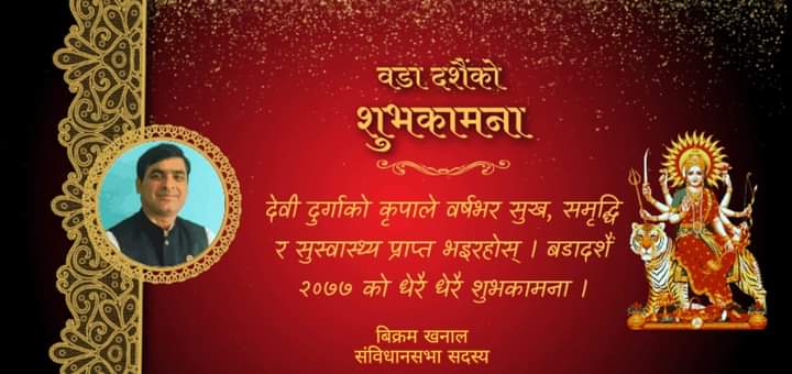 राष्ट्रिय दैनिक / नवलपरासी ,९ कार्तिक संविधानसभा सदस्य बिक्रम खनालले हिन्दू धर्मावलंबीले मनाउने महत्त्वपूर्ण चाड बड़ा दशैको सुभकामना व्यक्त गर्नुभएको छ। खनालले स्वदेश तथा विदेशमा रहनु भएका सम्पूर्ण नेपाली दाजुभाइ, दिदी बहिनीहरूमा महान चाड बड़ा दशै ,दिपावली , छठ पर्व तथा मुस्लिम धर्मावलम्बीको पर्व माेहम्मद जयन्तीको हार्दिक सुभकामना व्यक्त गर्नुभएको हाे । वहाँले देश तथा विदेशमा रहनु भएका सम्पूर्ण नेपाली दाजुभाई दिदी बहिनीहरुमा बडा दशैकाे अवसरमा सुस्वास्थ्य दीर्घायु र उत्तरोत्तर प्रगतिको कामना गर्दै शुभकामना ब्यक्त गर्दै समाजिक दुरी कायम गरी सतर्कता अपनाइ तडकभडक नगरी दशै मनाऔ अनुरोध गर्नुभएको हाे। यस वर्ष बिश्व नै कोरोना संक्रमणबाट प्रभावित भएको हुँदा नेपालमा पनि यसको प्रभाव परेको बताउदै कोरोना भाइरसको संक्रमणबाट बच्न र बचाउन हामी स्वयं आफ्नो स्वास्थ्य प्रति सजग हुनु पर्ने बताउनुभयो। राष्ट्रिय दैनिक राष्ट्रिय दैनिक एक लोकप्रिय नेपाली समाचार पोर्टल हो। हामी सत्य तथ्य निश्पक्ष र सन्तुलित समाचार सम्प्रेषण गर्ने तर्फ उद्दत छौँ । हाम्रा टोल,समाज, शहर वा आम जनताका चुलो चौको देखि सदन सम्म अथवा समाजका उदाहरणीय ब्यक्ति, रास्ट्रका पहरेदार हरेक बिषय हाम्रा समाचारका श्रोत हुन् । आवाज बिहिनहरुको आवाजमा साथ अनि सरकारको बेथितिमा हाम्रो निगरानी हुनेछ । हामी राजनितीको रंग भर्दैनौं तर राजनितीको चेतना अवश्य भर्ने छौं ।