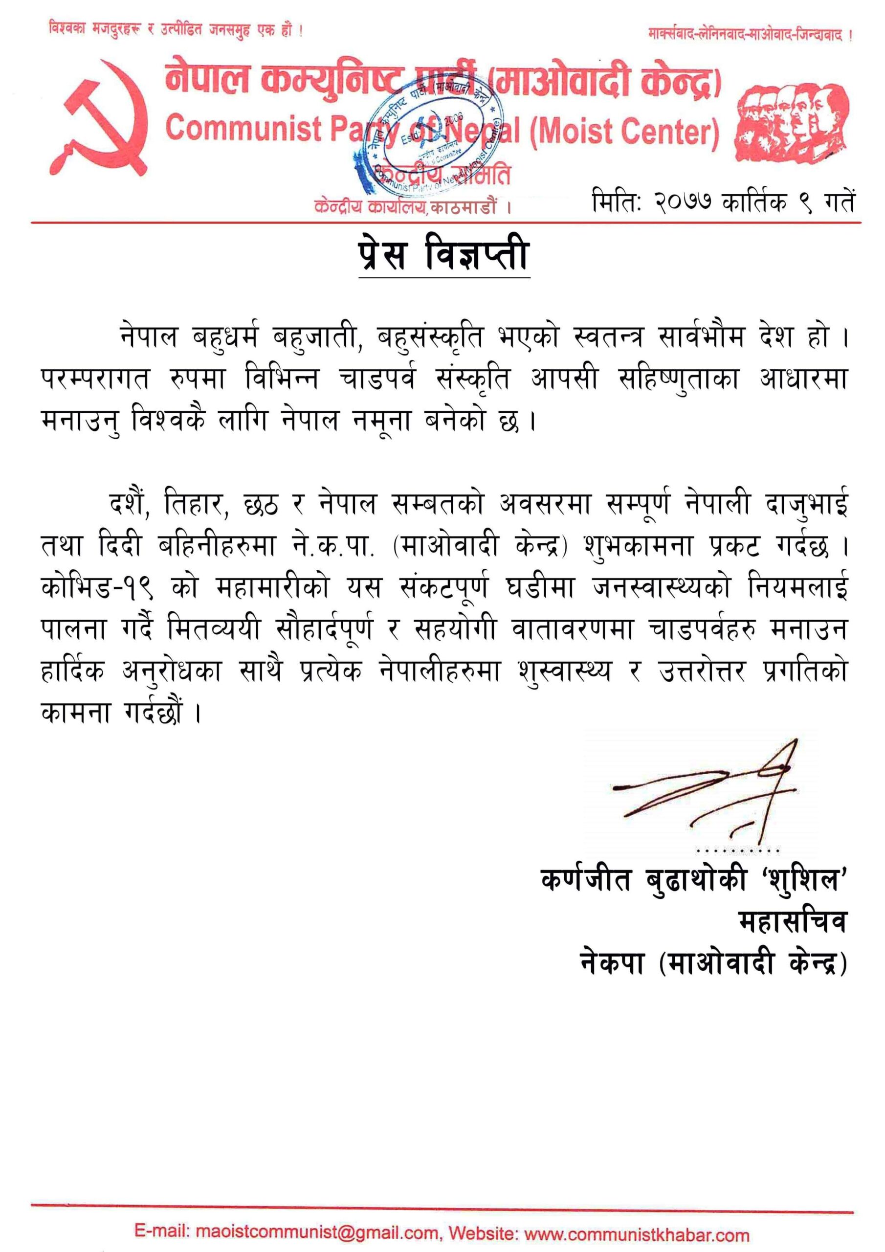 उच्च स्वास्थ्य सतर्कतासहित दशैं, तिहार लगाएतका पर्वहरु मनाउँन माओवादी केन्द्रको आग्रहः शुभकामना वक्तव्य जारी (पूर्णपाठसहित) नेपालीहरुमा शुस्वास्थ्य र उत्तरोत्तर प्रगतिको कामना दिनेशकुमार श्रीवास्तव काठमाडौं । नेपालीहरुको महान पर्व दशैंको आज सबैंभन्दा महत्वपूर्ण दिन अथार्थ विजयादशमी हो । आज हरेक हिन्दू आस्थावान नागरिकहरुले असत्यमाथि सत्यको प्रतिकका रुपमा रातो टीका र दुर्गाको प्रसादका रुपमा जमरा लगाउने गर्दछन । महान पर्व दशैंका साथै तिहार, छठ, नेपाल संम्बत लगाएत समेत नेपालीहरुको घर आँगनमा आउँदै गरेको अवस्थामा नेकपा (माओवादी केन्द्र) ले विश्वव्यापी महामारीको रुपमा देखिएको कोरोनाभाइरसको संक्रमणको अवस्थालाई ख्याल गर्दै, उच्च स्वास्थ्य सतर्कता अपनाउँदै आपसी सद्भाव बढाउँदै चाडपर्वहरु मनाउन आम नागरिकमा आग्रह गरेको छ । माओवादी केन्द्रका महासचिव कर्णजीत बुढाथोकी ‘शुशिल’ ले हिजो एक शुभकामना वक्तव्य जारी गदैं पार्टीको केन्द्रीय समितिको तर्फबाट सम्पूर्ण नेपाली नागरिकमा शुभकामना दिएका हुन । त्यस्तै माओवादी केन्द्रको सुदूरपश्चिम प्रदेश समितिको तर्फबाट समेत हिजो प्रदेश इन्चार्ज रंगनाथ ढकाल र संयोजक लोकेशले संयुक्त हस्ताक्षरमा शुभकामना वक्तव्य जारी गरेका छन । माओवादी केन्द्रले आफ्नो वक्तव्यमा नेपाल बहुधर्म बहुजाती, बहुसंस्कृति भएको स्वतन्त्र सार्वभौम देश भएको उल्लेख गर्दै परम्परागत रुपमा विभिन्न चाडपर्व संस्कृति आपसी सहिष्णुताका आधारमा मनाउनु विश्वकै लागि नेपाल नमूना बनेको बताएको छ । दशैं, तिहार, छठ र नेपाल सम्बतको अवसरमा सम्पूर्ण नेपाली दाजुभाई तथा दिदी बहिनीहरुमा शुभकामना दिदै माओवादी केन्द्रले कोभिड–१९ को महामारीको संकटपूर्ण घडीमा जनस्वास्थ्यको नियमलाई पालना गर्दै मितव्ययी, सौहार्दपूर्ण र सहयोगी वातावरणमा चाडपर्वहरु मनाउन हार्दिक अनुरोध गरेको छ । माओवादी केन्द्रले प्रत्येक नेपालीहरुमा शुस्वास्थ्य र उत्तरोत्तर प्रगतिको कामना गरेको छ । नेपाली समाजमा एक समुदायले अर्को समुदायमा मनाइने पर्व, उत्सवहरुमा आपसी सद्भाव बाड्दै, सहिष्णुतापूर्ण रुपमा मनाउने संस्कार विकास गरेको विज्ञप्तीमा उल्लेख गरिएको छ । त्यसले नेपाल ‘अनेकतामा एकता’ बोकेको, आपसी सद्भावले भरिएको मुलुकका रुपमा परिचित बनेको भन्दै माओवादी केन्द्रले अन्य देशमा जस्तो नेपालमा एक समुदायले अर्को समुदायको संस्कृति, संस्कारमाथि आक्रमण, हमला गर्ने अवस्था नरहेको र सद्भावपूर्ण सम्बन्ध जोडिएको बताएको छ । बाँकी विज्ञप्तीको पूर्णपाठ हेर्नुहोस् नेपाल कम्युनिष्ट पार्टी (माओवादी केन्द्र) केन्द्रीय समिति प्रेस विज्ञप्ती मितिः २०७७ कार्तिक ९ गतें । नेपाल बहुधर