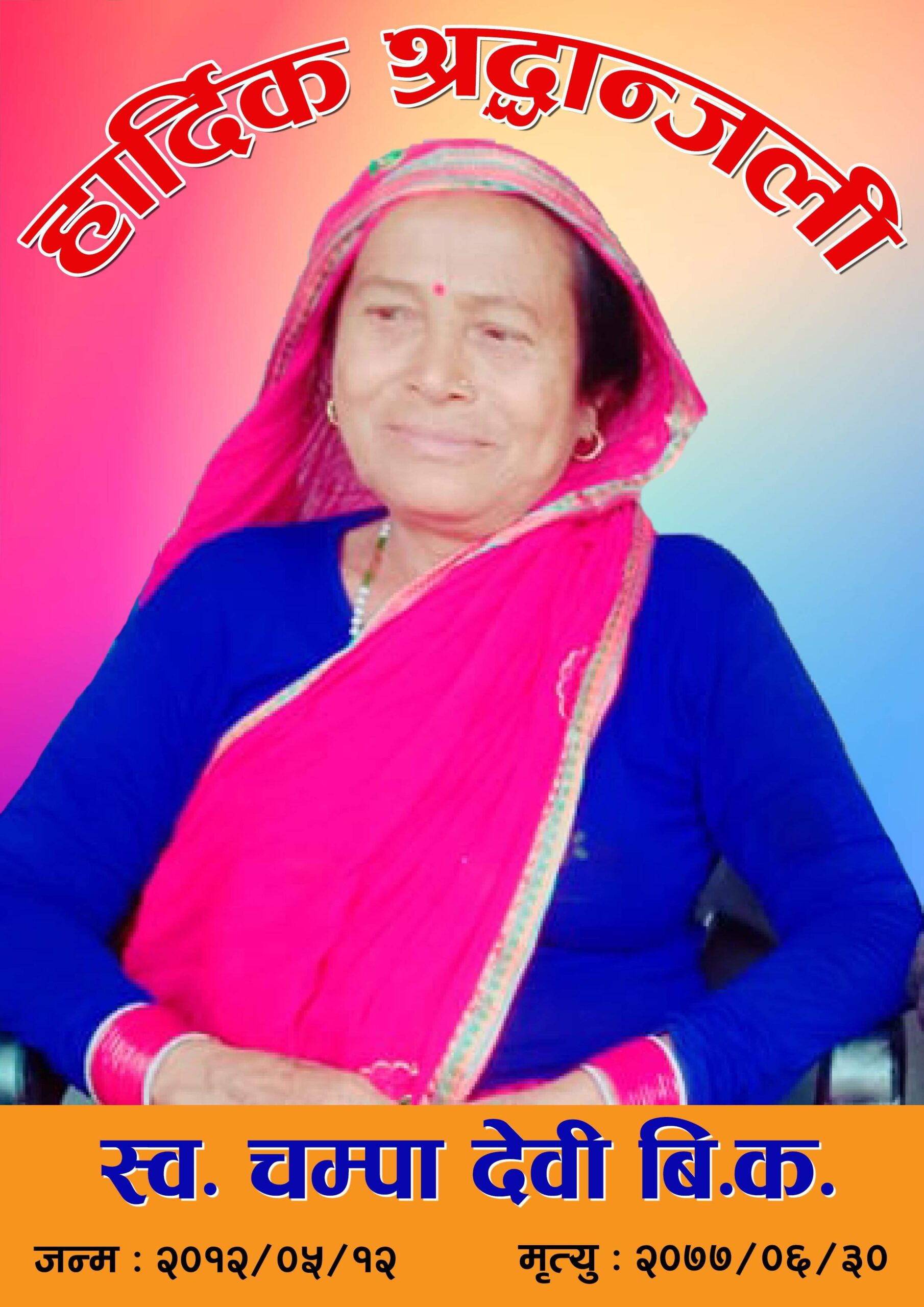 मृत्यु सृष्टिको एउटा प्रक्रिया हो – सांसद कण्डेल उमेश बि.क / नवलपरासी ,१२ कार्तिक नेपाली काङ्ग्रेसका केन्द्रीय सदस्य तथा प्रतिनिधिसभा सदस्य देबेन्द्रराज कण्डेलले मृत्यु सृष्टिको एउटा प्रक्रिया रहेको बताउनु भएको छ । नेपाल प्रेस युनियन जिल्ला उपसभापति उमेश कुमार बि.क काे ठुलीअामाकाे १३ अाैँ दिनको पुण्यतिथिमा अायाेजित शाेक सभा कार्यक्रममा बाेल्दै सांसद कण्डेलले सबैभन्दा अप्रिय केही छ भने त्यो मृत्यु हो । सबैभन्दा ठूलो शाश्वत सत्य पनि मैले हेर्दा मृत्यु नै लाग्छ । मृत्यु कहिले हुन्छ थाहा छैन । कसरी हुन्छ भन्न सकिन तर हामी मर्छौं चाहेर पनि मर्छौं नचाहँदा नचाहँदै पनि मर्छौं । यस सत्यप्रति कोही अनभिज्ञ छैनौँ । हामी सम्पुर्ण ब्यक्तिकाे समाजमा याेगदान हुनुपर्छ । मरेर जादा त्यहि याेगदान र गरेको काम त्यस ब्यक्तिलाई हमेशा जिबित राख्ने गर्दछ । स्वर्गीय चम्बा देवी बि.क जिवित छदा स्वयंसेवीकाकाे चुमिका निर्वाह गरेकोले समाजले एउटा ठुलाे समाजसेवी तथा जनशक्ति गुमाएको छ। महिलाकाे प्रसुति पिडा देखि हरएक काममा वहाँले गरेको याेगदान प्रती हामी सम्मान गर्दछौं । बि.क परिवारबाट अाफु र नेपाली काङ्ग्रेस नजदिक रहेकाे बताउदै हरेक सुखदुःखमा नेपाली काङ्ग्रेस साथ दिने प्रतिबद्धता ब्यक्त गर्नुभएको हाे । साथै दिवंगत अात्माकाे चिर शान्तिकाे कामना गर्दै शाेक सन्तप्त परिवार प्रति धैर्य धारण गर्ने शक्ति प्रदान हाेस भनी हार्दिक सम्बेदना ब्यक्त भएको हाे । त्यस्तै सरावल गाउँपालिका उपाध्यक्ष उत्तमा रायले समाजसेवी खेम बहादुर बि.क काे धर्मपत्नी तथा राजेन्द्र बि.क काे ममतामयी आमा बितेकाे हुनाले सरावल गाउँपालिका नै मर्माहत एबं दु:खी तुल्याएको छ। उहाँ र उहाँको परिवारले गरेको पार्टी र समाजप्रतिको योगदानलाई कदर गर्दै योगदानको प्रसंसा गर्नुभएको हाे । महिला स्वयंसेवीकाकाे भुमिका निर्वाह गर्दै महिलाकाे प्रसुति पिडा देखि हरएक काममा वहाँकाे याेगदान हामी माझ स्मरण रहेकाे बताउदै वहाँकाे कमिको महसुस भएको बताउनुभयो । सरावल गाउँपालिका वडा नं. ३ निवासी स्वर्गीय चम्बा देवी बि.क को ६५ बर्षकाे उमेरमा भएको असमाहिक निधनप्रति वहाँकाे संझनामा एक मिनेट मौन धारण गर्दै सुरु गरिएको कार्यक्रममा उपस्थित सबैले वहाँको तस्विरमा फुलका गुच्छा, माला पहिराई श्रद्धान्जिली अर्पण गरेका थिए । शाेक सभामा नेपाली काङ्ग्रेसका नेता अनिल गाैड,वडा नं. ३ सभापति बसिर मुसलमान ,सरावल स्वास्थ्यशाखा सहसंयाेजक अशोककुमार पाण्डेय ,समाजसेवी शिव नरायण फाैजदार ,नेपाली काङ्ग्रेस सरावल गाउँपालिका सभापति विनोद पाण्डेय लगाएतकाे वक्ताहरुले सच्चा ईमान्दार, समाजसेवी तथा महिला स्वयंसेविका गुमाउन परेकोमा दुःख व्यक