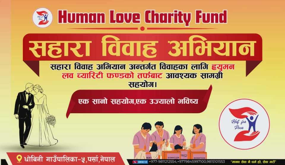 पर्सा ७ बैशाख धोबिनी–५ मा सक्रिय ह्युमन लभ च्यारिटी फन्ड ले पछिल्ला चार वर्षदेखि निरन्तर सामाजिक सेवा गर्दै स्थानीय समुदायमा सकारात्मक प्रभाव पार्दै आएको छ। संस्थाले अहिलेसम्म करिब ३०० भन्दा बढी विपन्न र असहाय परिवारलाई प्रत्यक्ष सहयोग पुर्याइसकेको जनाएको छ। संस्थाको पहलमा स्वास्थ्य, शिक्षा र आपतकालीन राहतका क्षेत्रमा विभिन्न कार्यक्रम सञ्चालन हुँदै आएका छन्। […]